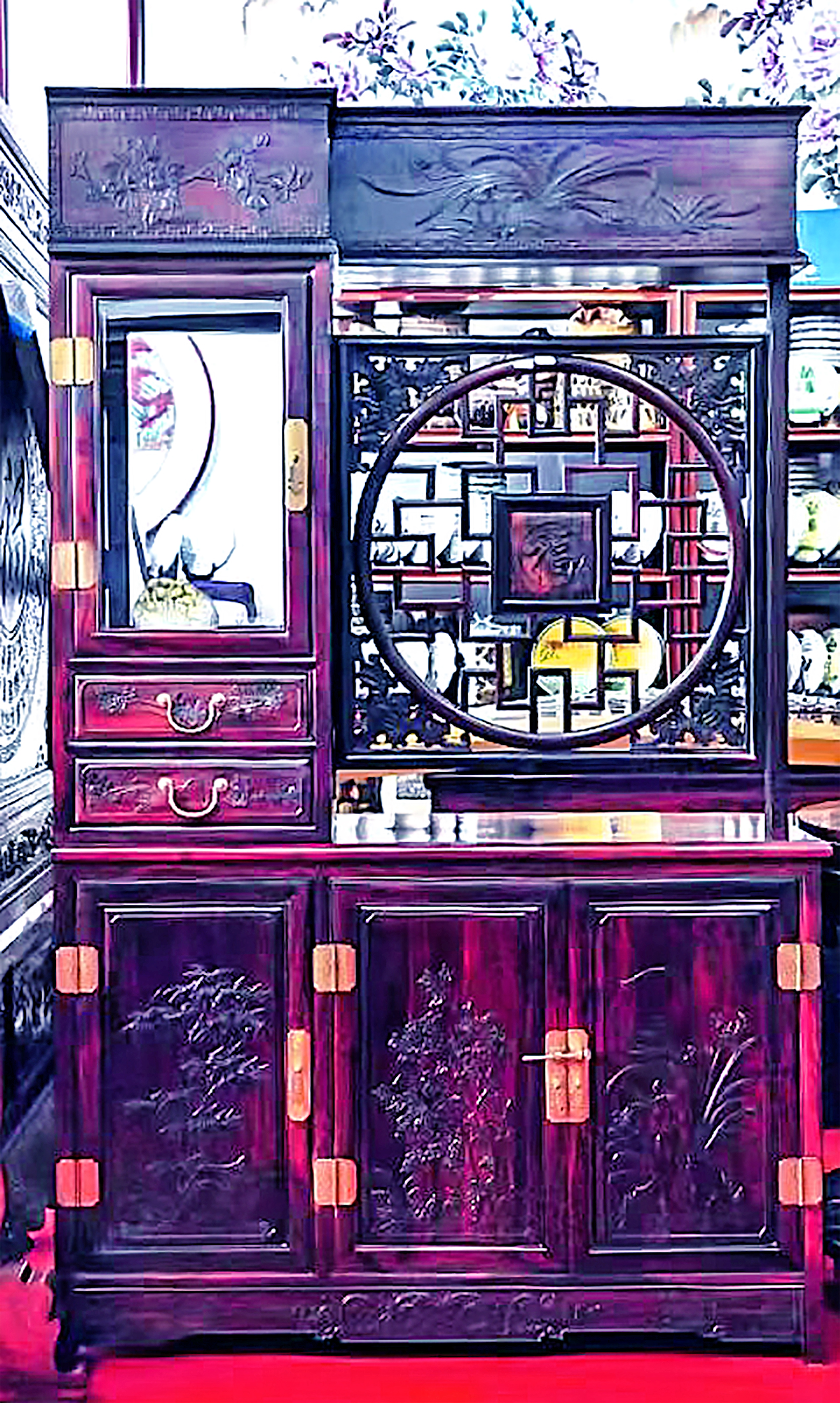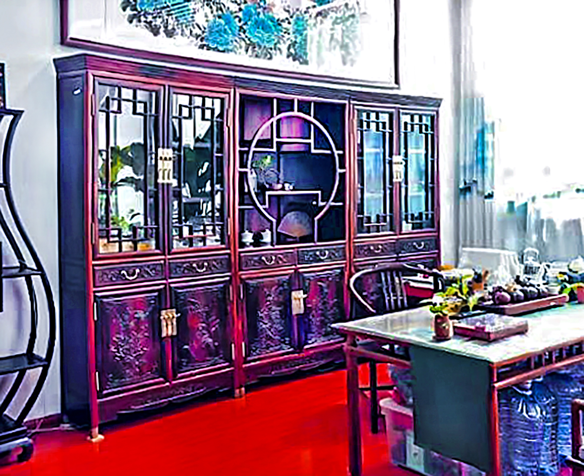 和熙斋所珍藏的老挝酸枝木家具,更是精品中的精品。精选老挝南部百年独株独板大料,一木一器,纹理连贯如画卷铺展;全榫卯结构,无一钉一胶,承古法之精魂;手工精雕山水花鸟,刀锋游走处,气韵生动,呼之欲出。每一件,皆是匠养器的孤品。