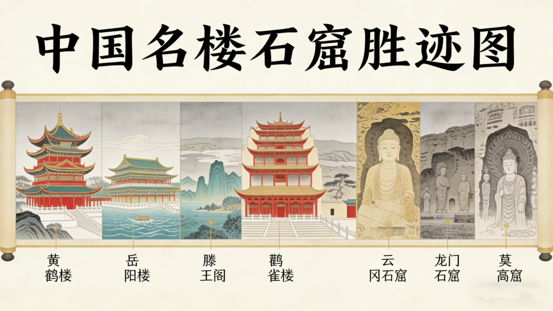 《名楼石窟》,包括黄鹤楼、岳阳楼、滕王阁、鹳雀楼、云冈石窟、龙门石窟和莫高窟。黄鹤楼屹于江城,崔颢题诗,仙踪杳杳。晴川芳草,牵游子乡愁;龟蛇锁江,阅千年潮浪。岳阳楼雄踞巴陵,范公挥毫,忧乐萦怀。洞庭波涌,吞万里云涛;衔山吞江,载千古文章。滕王阁临江而建,王勃作序,霞鹜齐飞。画栋雕梁,溢临川之秀;落霞秋水,凝南国之章。鹳雀楼耸于蒲津,之涣放歌,河山入望。白日西沉,映黄河九曲;凭栏极目,抒壮志满腔。云冈石窟镌于武周,昙曜开窟,胡汉交融。大佛巍峨,容中西之韵;飞天灵动,舞丝路之光。龙门石窟伊水为伴,卢舍那笑,雍容万方。魏碑风骨,存书艺之盛;造像万千,证佛法之昌。莫高窟鸣沙为邻,壁画斑斓,飞天曼舞。藏经洞藏,纳丝路之秘;彩塑传神,绘佛国之祥。览斯胜迹,叹天地之钟灵,感人文之渊薮,壮哉中华,美哉九州!