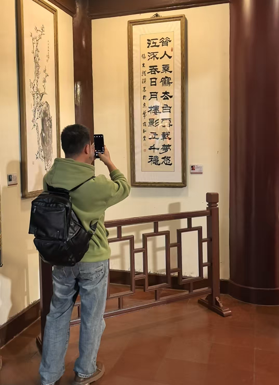 图3、2024年黄鹤楼管委会应邀为黄鹤楼创作诗词: “昔人乘鹤去,白云载梦悠。江流吞日月,楼影立千秋”。已悬挂在黄鹤楼主楼三层。