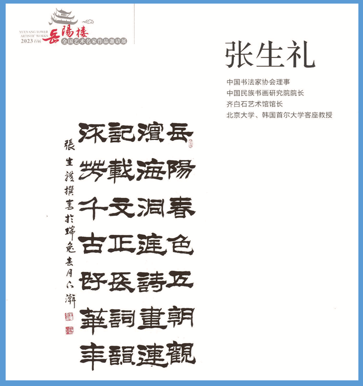 图2、2023年岳阳楼管理委等部门隆重举办首届全国《岳阳楼杯》书法创作展,我创作的:“岳阳春色五朝观,滨海洞庭诗画连。记载文正长词韵,流芳千古好华年”被刻在岳阳楼长廊之中。