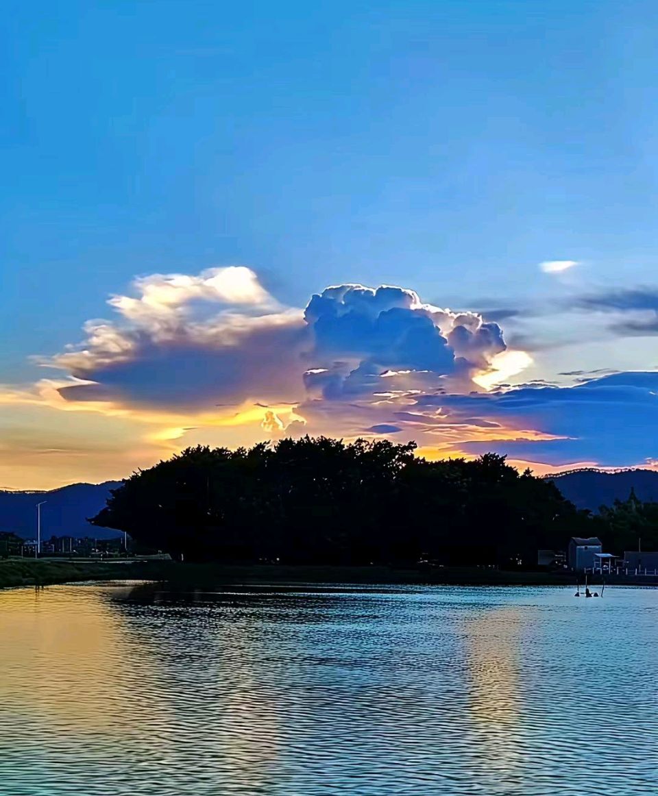 仙岛梦云升旭日,蓝天碧水挂帆舱。