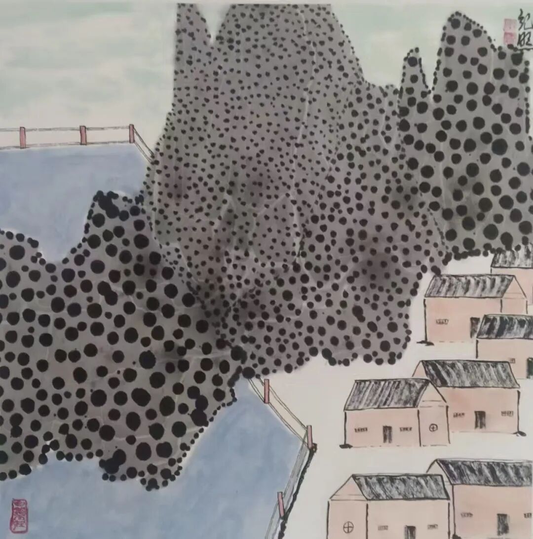 《圆点山水图》则以独创的墨点语言,重构山水意象,尽显澄明自在之境。画面中山峦、林木由大小错落的墨点铺就,彻底消解了传统山水的繁复皴法,以极简的当代构成,营造出空灵静谧的山居意境。疏朗的村居、澄澈的水岸隐于点墨之间,墨点的疏密、浓淡与留白相互呼应,共同构筑出 “一念清净,山河大地皆清净” 的禅境。