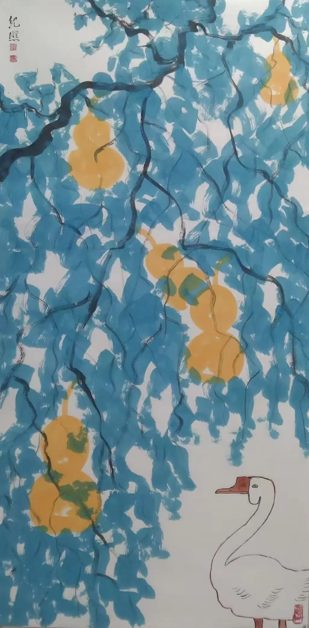 《葫芦白鹅图》是其花鸟题材的禅意典范,以泼蓝写藤叶,浓墨书虬枝,暖黄点染葫芦,白鹅静立一隅,笔墨奔放而意趣天真。大面积的钴蓝泼洒如晴空如洗,虬劲的墨藤如生命脉络肆意舒展,暖黄葫芦悬于叶间,既藏 “福禄” 之吉祥寓意,又显田园之生机盎然;右下角白鹅以极简线条勾勒,造型稚拙天真,神态安然从容,恰如王维 “行到水穷处,坐看云起时” 的禅意写照。画面色彩对比鲜明却和谐共生,满幅生机中见出一份从容不迫,藏着创作者对田园本真的向往,对精神自在的永恒追求,于一花一鸟、一藤一葫间,尽显禅者的安然与通透。