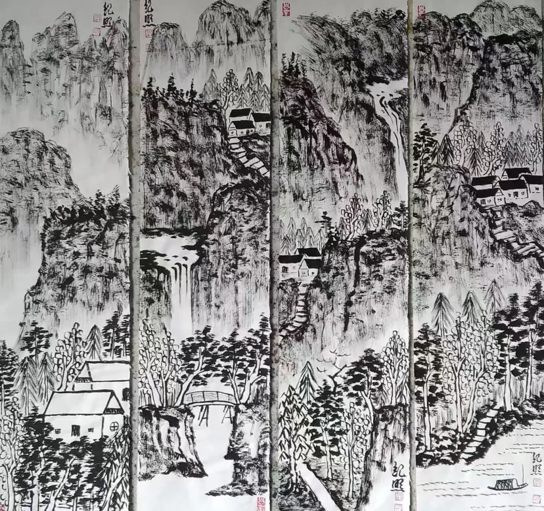 《焦墨山水四条屏》则以笔墨彰显庄严,于山水间观照本心。作品以纯墨为媒,以干笔浓墨为骨,顿挫皴擦间,峰峦巍峨、飞瀑流泉、村居石桥、林木葱茏跃然纸上。四屏既独立成景,各有天地,又合为一轴,浑然一体,将山水的雄浑壮阔与归隐的安然静谧融为一体。线条的金石力量与造型的朴拙温度相映成趣,笔墨的虚实相生间,营造出 “山河大地,无非自性” 的庄严禅境。