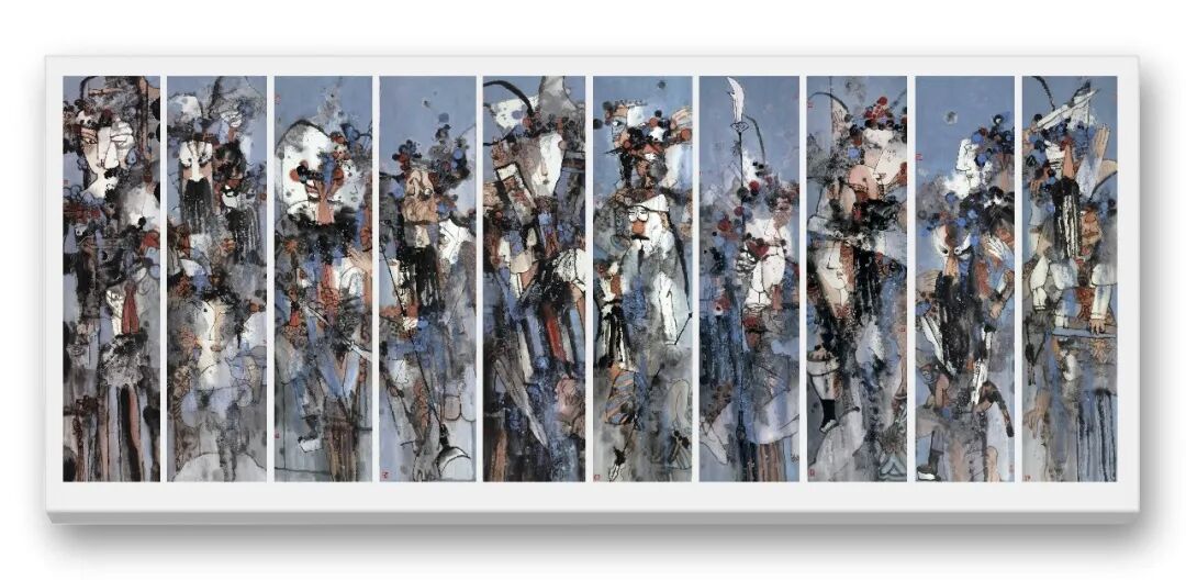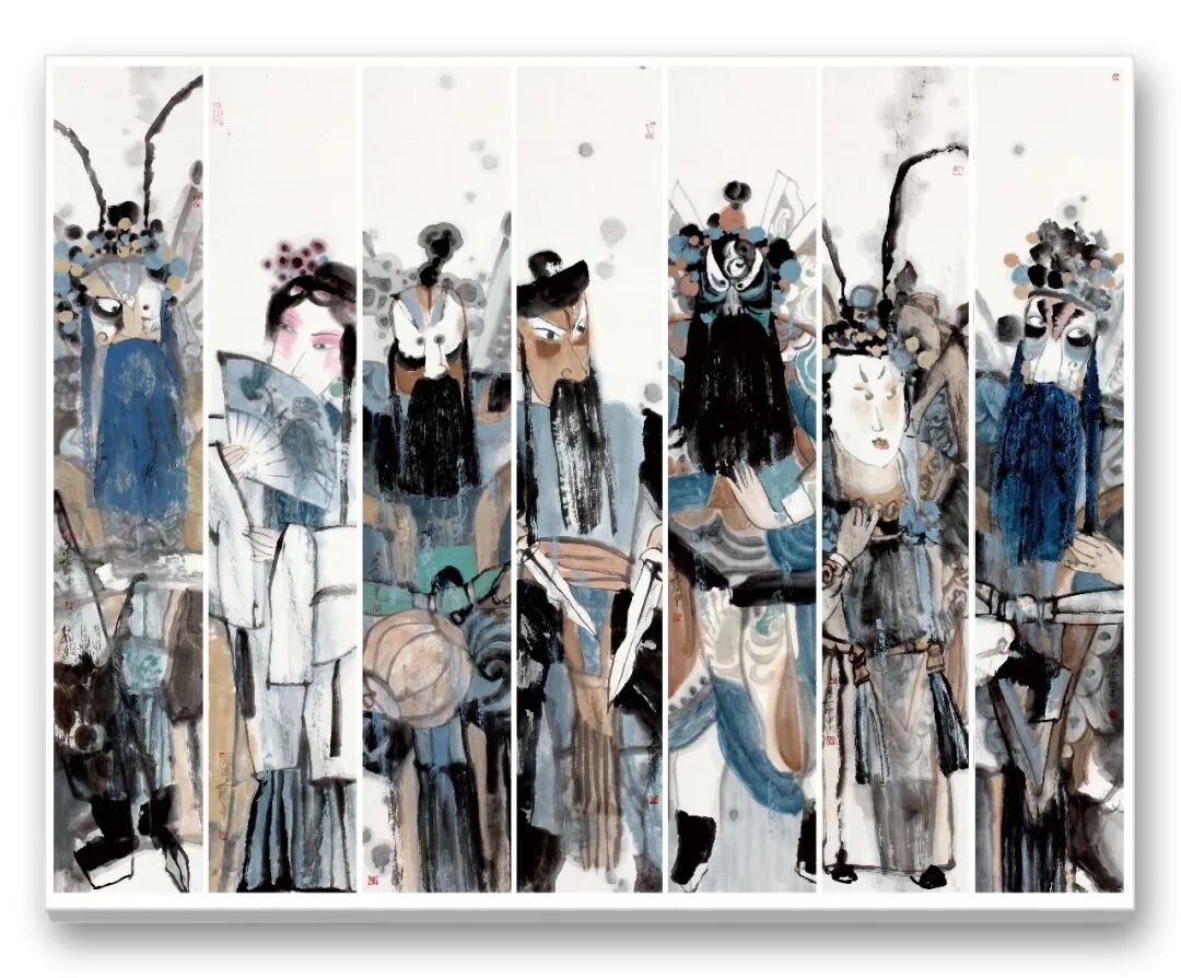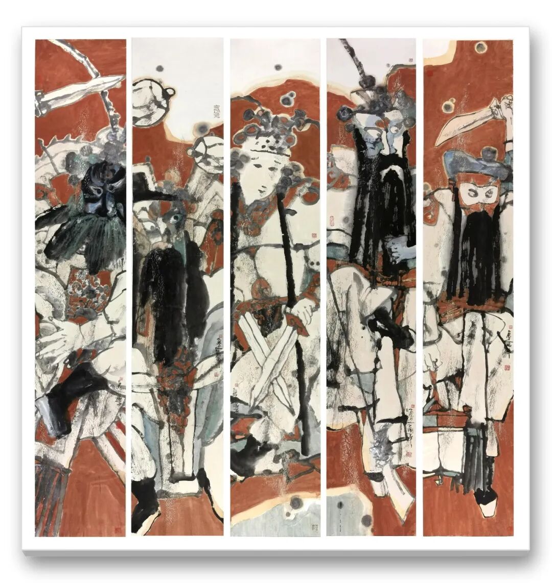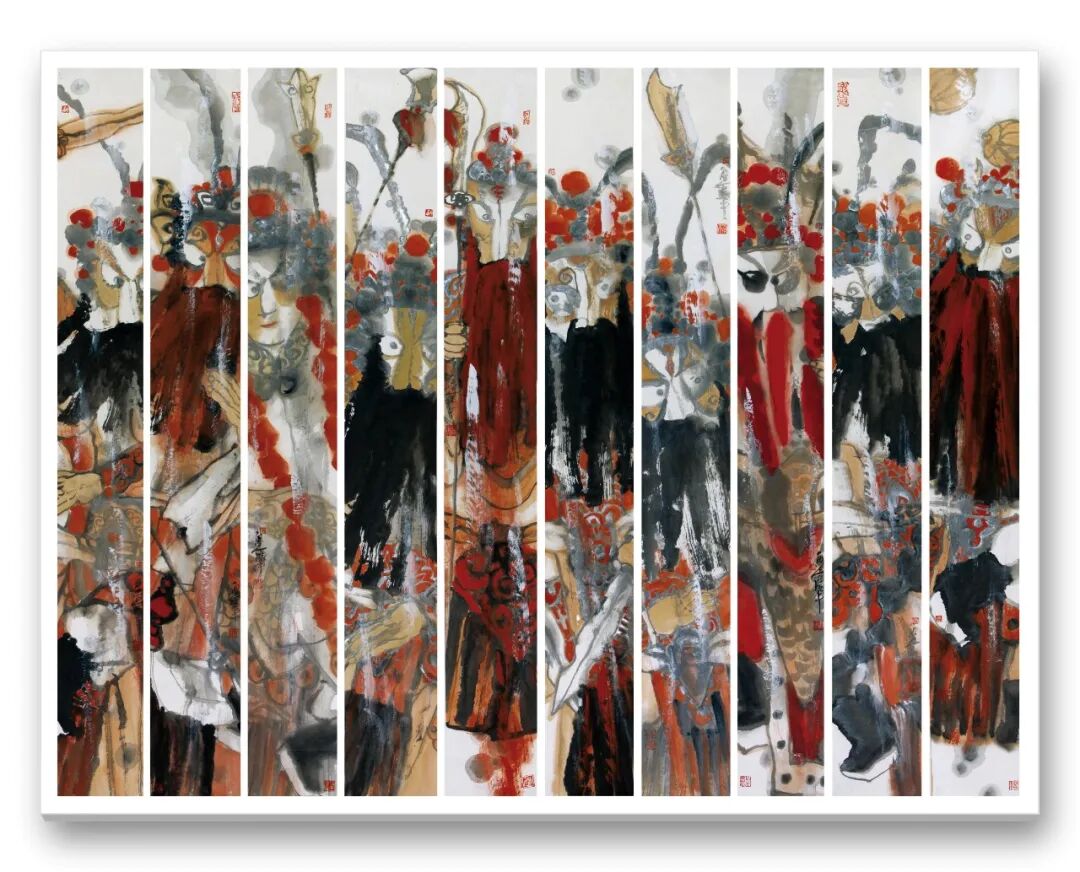 笔墨之外,周卫平更重文化内涵与审美创新,在传统与当代碰撞中走出特色之路。他借鉴民间木版年画、剪纸色彩精髓,融入现代构图,打破传统条屏束缚,以解构重组营造韵律美,反透视手法增添视觉张力。《梨园千秋》以条屏联动展现生旦净末丑群像,笔墨苍劲、色彩明快,既显戏曲包罗万象,又传中华文脉厚重,更让中国戏曲神韵借水墨走向世界。