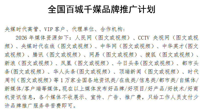 四、百城千媒新矩阵-全网覆盖大传播:整合全域媒体资源,统筹百城核心资源,打通国家级、省级、市级传统媒体与头部新媒体、短视频的新矩阵,构建立体化、精准化的品牌传播平台,定制一体化传播方案,实现品牌信息的全网无死角覆盖,让企业声量击穿圈层,铸就行业口碑,扩大影响力、提升领导力、增强竞争力。