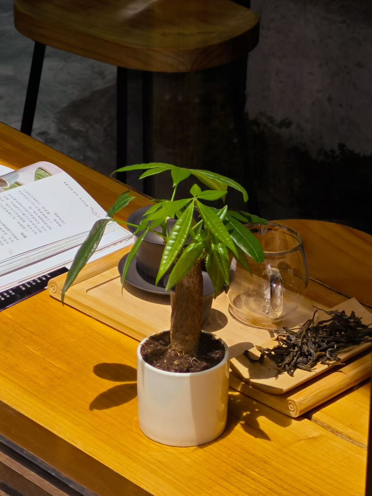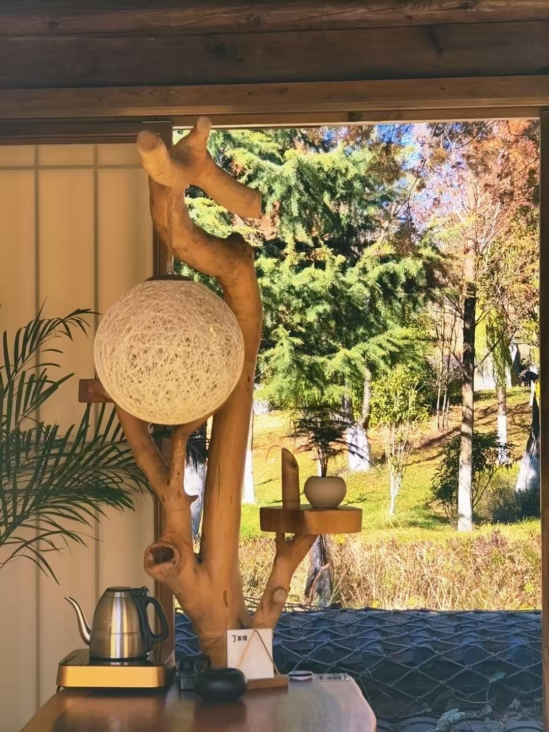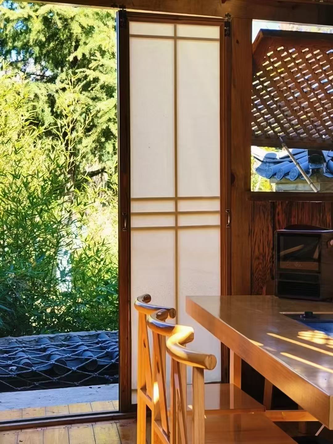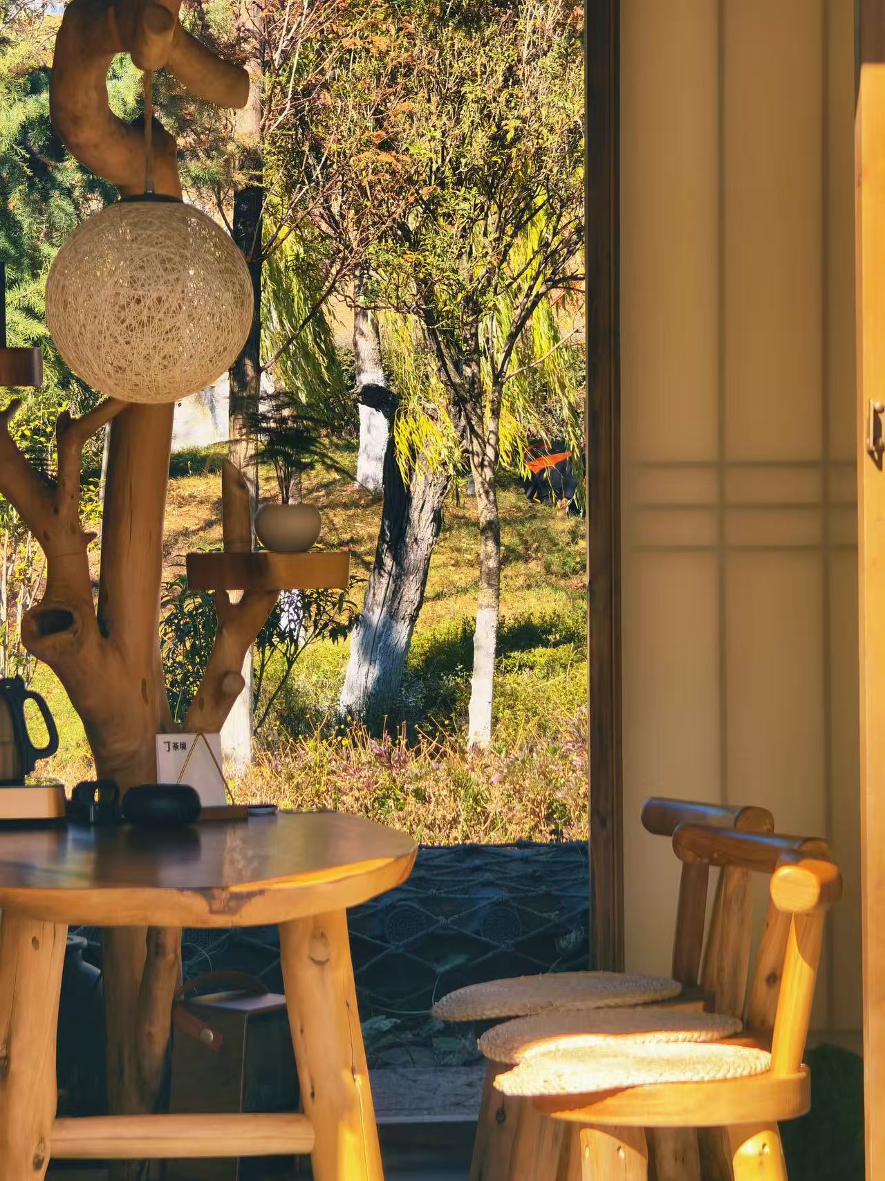 室内茶区是茶境清溪台的核心区域,分为雅间与散座,整体色调以原木色、米白色为主,搭配浅灰色的地面与窗帘,简约而不单调,沉稳而不压抑,完美诠释了“简约即高级”的现代美学。墙面没有过多的装饰,仅悬挂着少量纳西族东巴文书法作品、茶文化画作,以及木澜玥收藏的老茶器,每一件都承载着独特的文化意义。雅间以“清、幽、雅、静”为基调,命名均与茶、山水相关,如“清溪阁”“雪山轩”“茶韵堂”“东巴茶舍”,每个雅间都配有独立的茶台、茶具与休息区,墙面采用半通透的木质格栅设计,既保证了私密性,又能让自然光线透过格栅洒入室内,形成光影交错的美感。