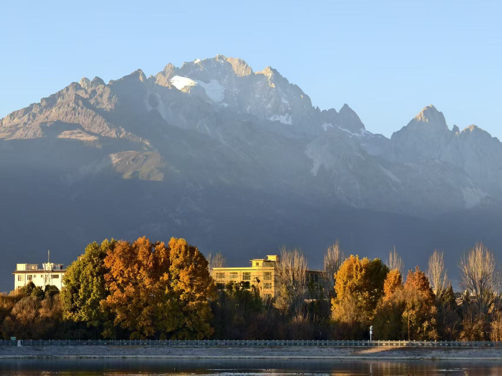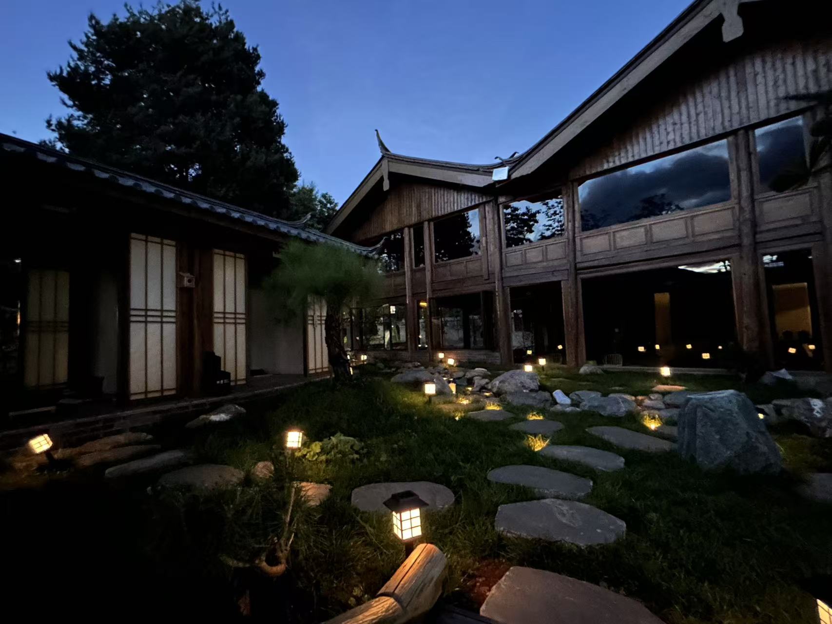选址的考量,尽显木澜玥的用心。经过反复斟酌,茶境清溪台最终定格在丽江古城区玉泉路,这里远离丽江古城的喧嚣,山水相依,草木葱茏,空气里弥漫着山间草木的清香与湖水的湿润,是丽江少有的静谧之地,也是最契合茶文化本质的所在。站在这里,玉龙雪山的十三峰倒映在清溪水库的湛蓝水面,宛如一幅水墨长卷;清晨,晨雾在水面蒸腾,垂钓者的身影若隐若现,茶香与雾气交织,如梦似幻;傍晚,夕阳将雪山染成金色,“日照金山”的奇景令人屏息,晚风裹挟着茶香,温柔而治愈。