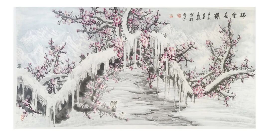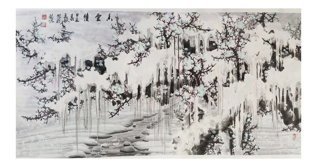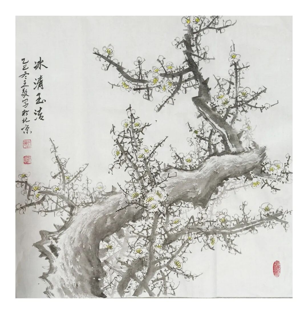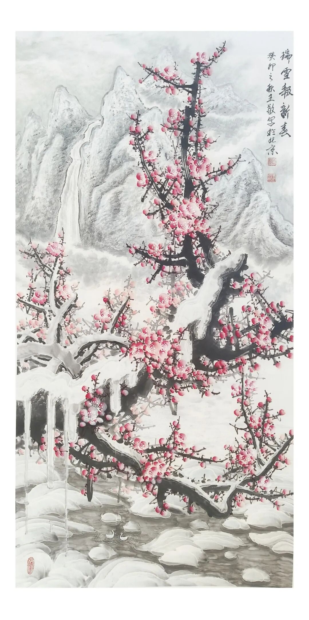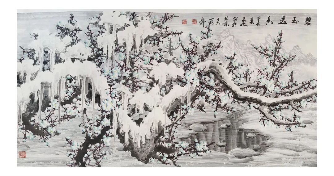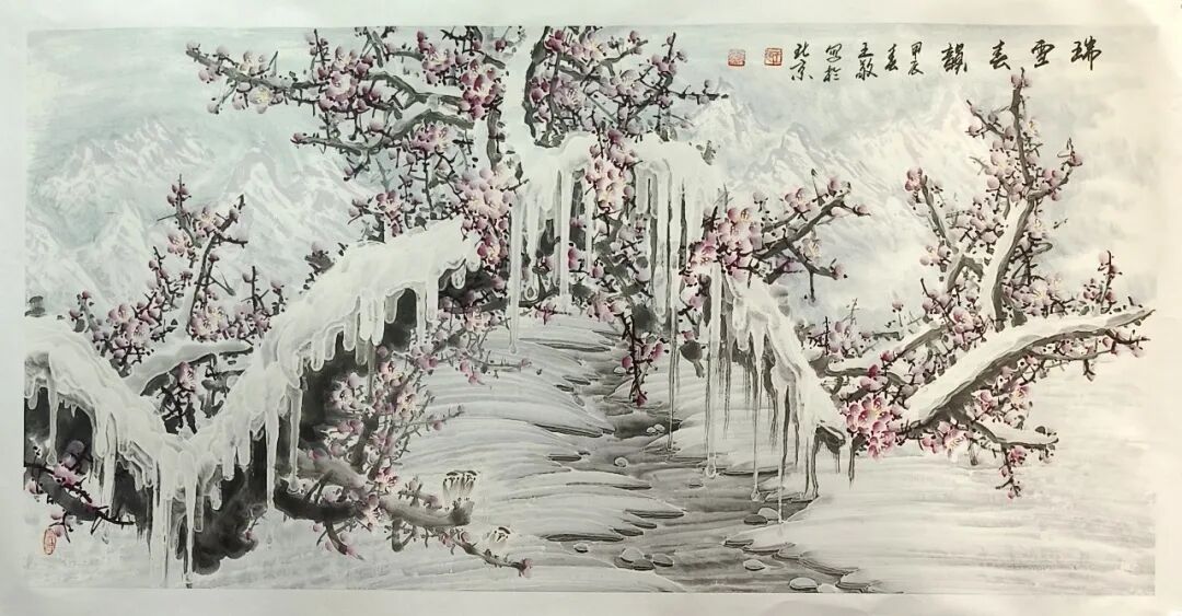 就比如他的众幅花鸟雪景作品,王敬先生是极善以水墨留白来表现积雪的厚度。画中花鸟虬枝负雪而骨气峥嵘,用笔皴擦间使老干如铁;嫩蕊含霜却暗香浮动,淡彩点染处更是新萼生辉!通幅画面,是谓一派暗香浮动,清雅之韵,妙不可言!十余年来,王敬先生独守雪景一脉,以雪明志,借雪抒情。可以说,其画作承载的是对纯净世界的向往,更是对中国传统文人"澄澈心灵"的追求。寄真情于其中,赋诗意于画端,能造就出如今的冰雪画意,实乃厚积薄发之功!