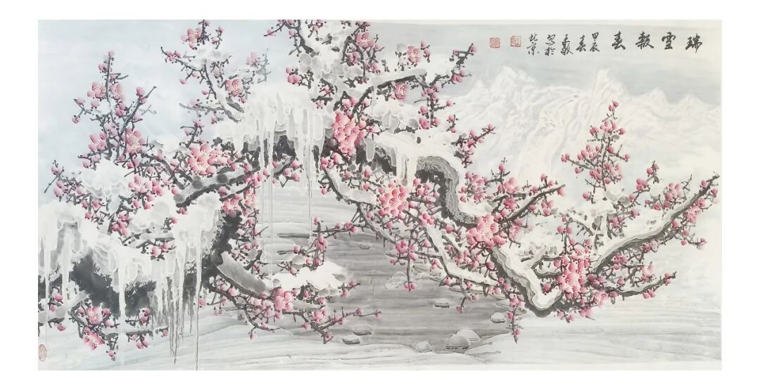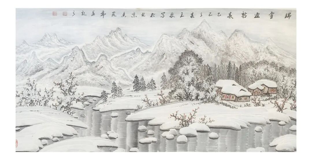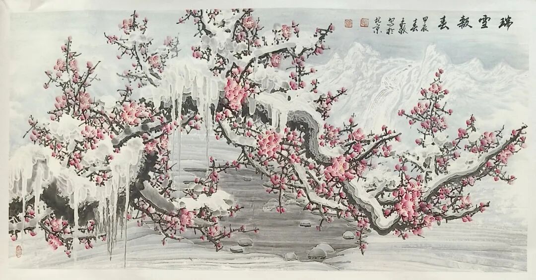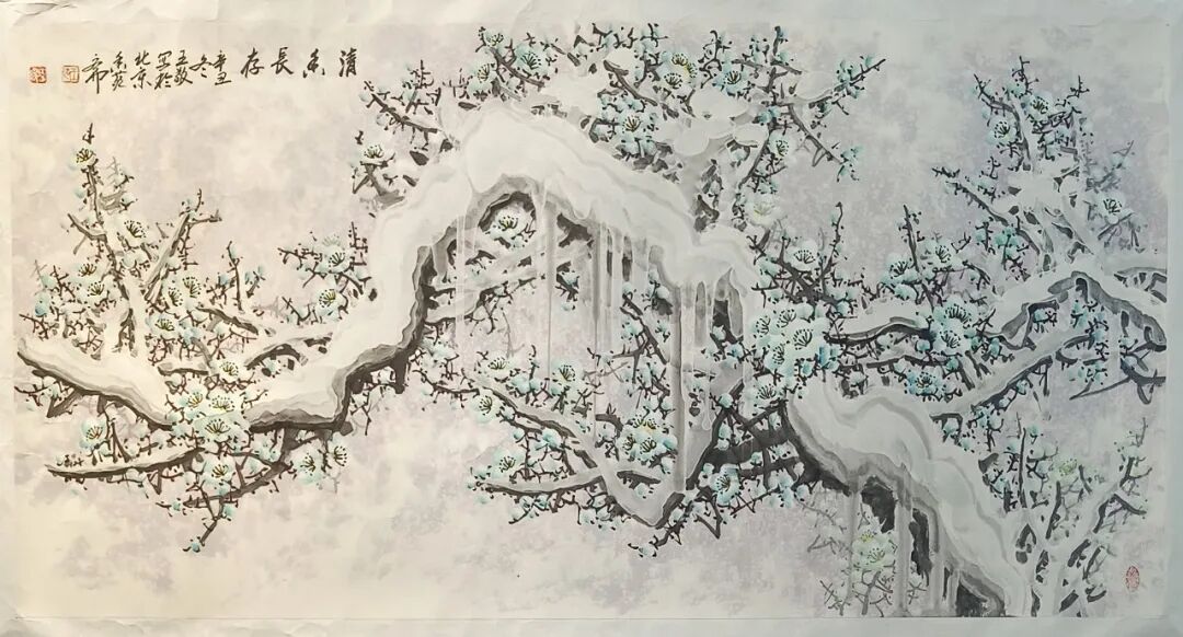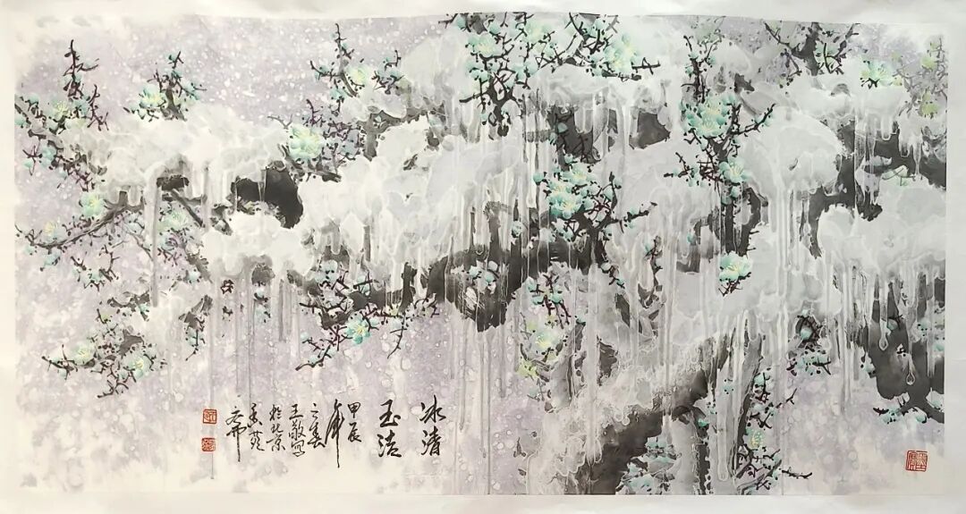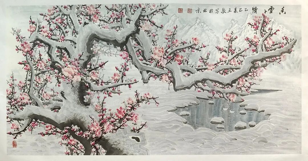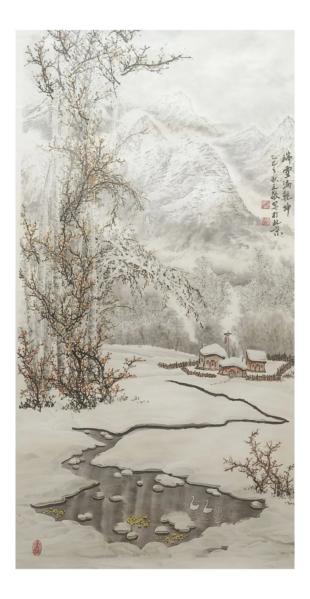 就比如他的众幅花鸟雪景作品,王敬先生是极善以水墨留白来表现积雪的厚度。画中花鸟虬枝负雪而骨气峥嵘,用笔皴擦间使老干如铁;嫩蕊含霜却暗香浮动,淡彩点染处更是新萼生辉!通幅画面,是谓一派暗香浮动,清雅之韵,妙不可言!十余年来,王敬先生独守雪景一脉,以雪明志,借雪抒情。可以说,其画作承载的是对纯净世界的向往,更是对中国传统文人"澄澈心灵"的追求。寄真情于其中,赋诗意于画端,能造就出如今的冰雪画意,实乃厚积薄发之功!