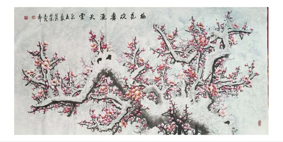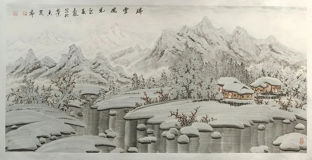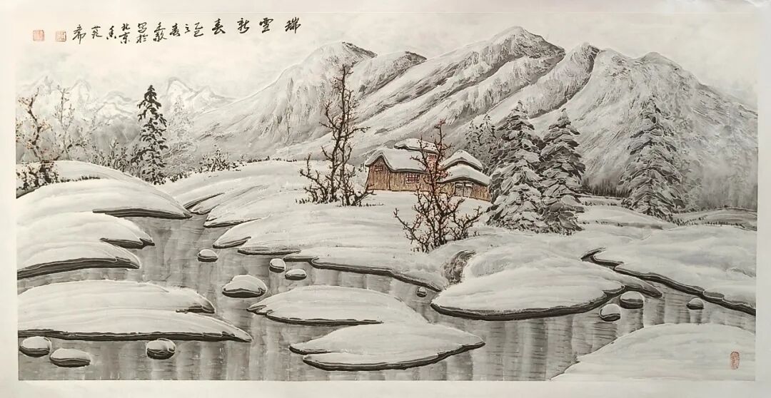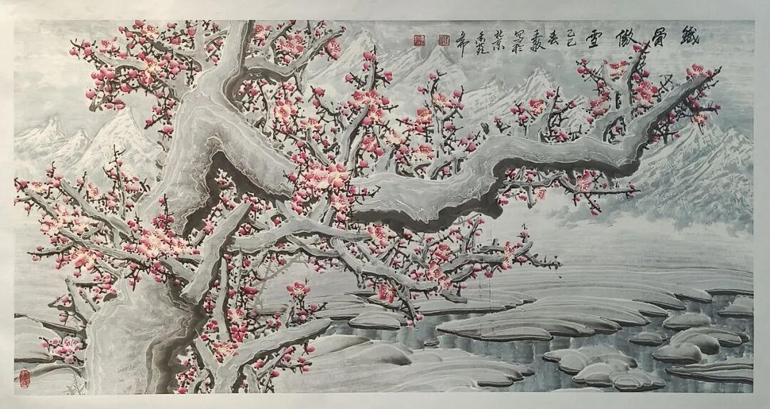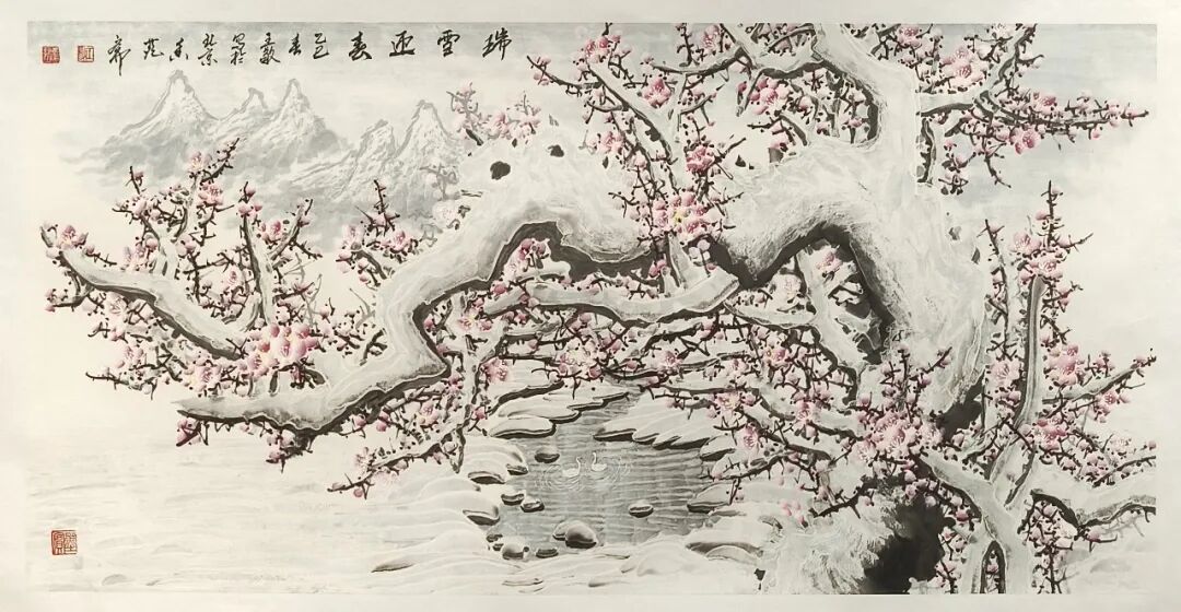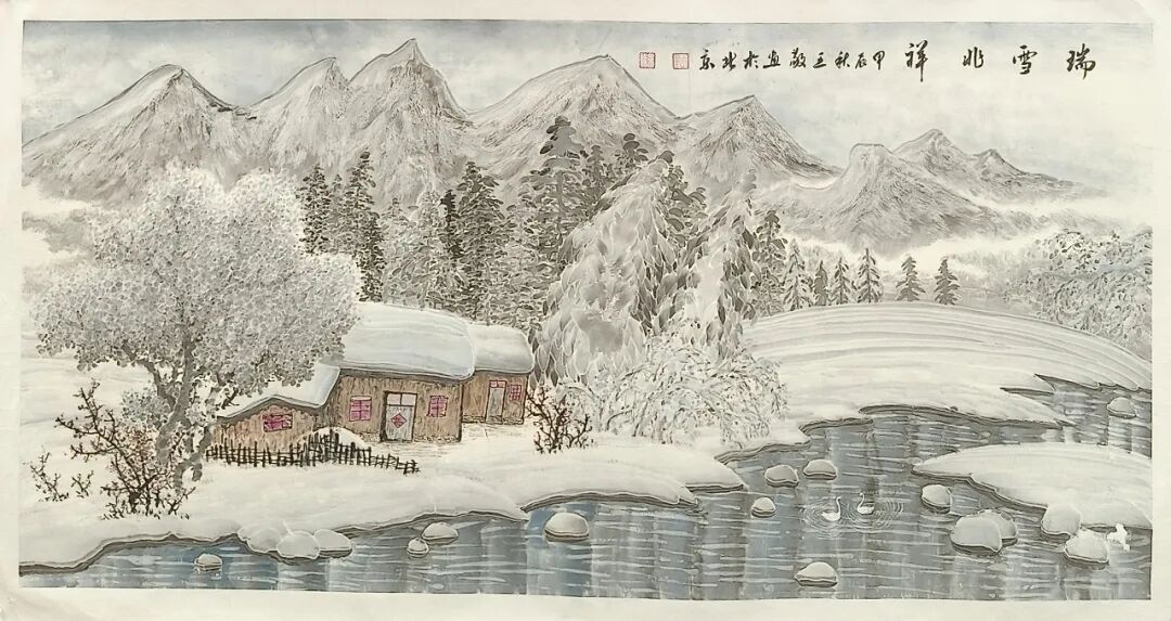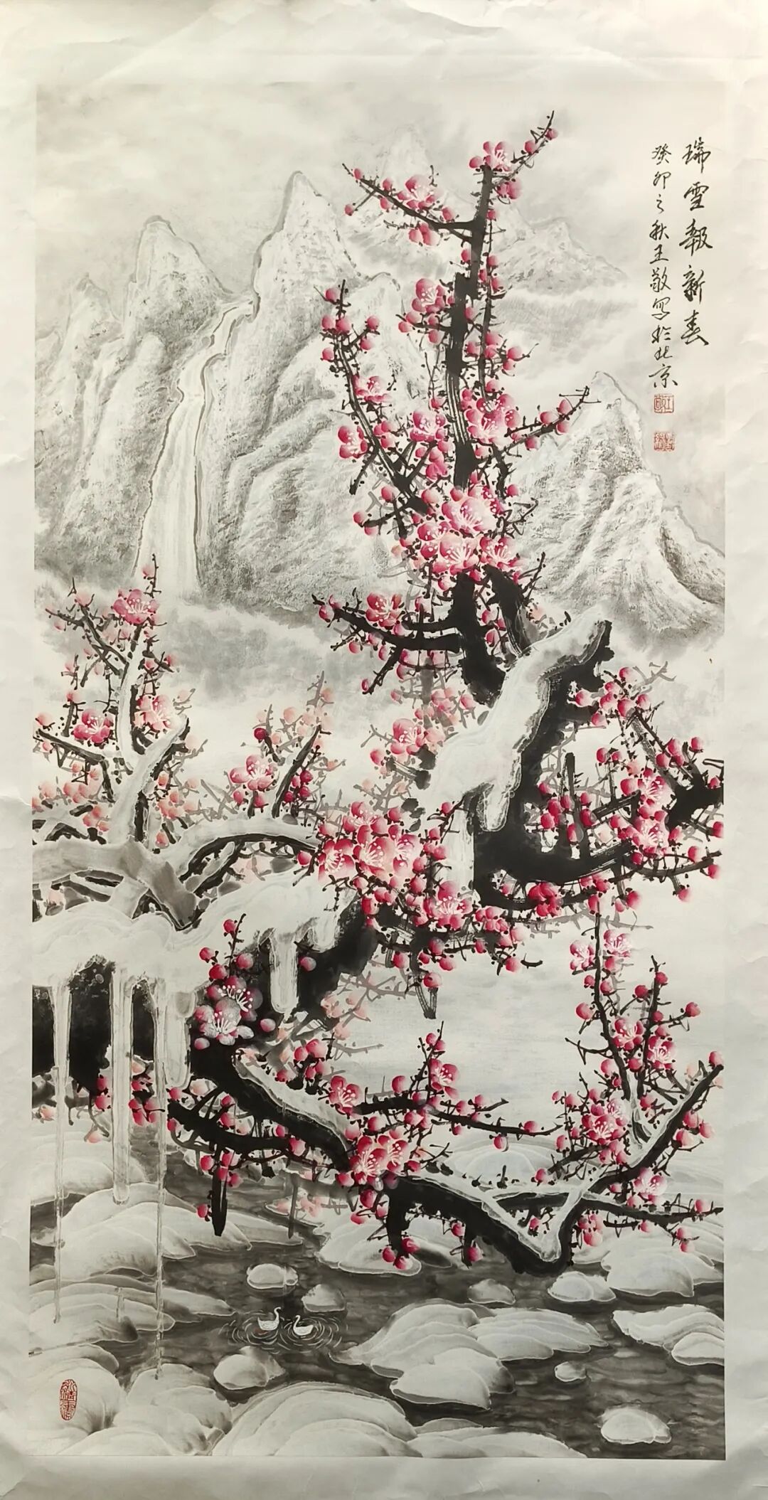 就比如他的众幅花鸟雪景作品,王敬先生是极善以水墨留白来表现积雪的厚度。画中花鸟虬枝负雪而骨气峥嵘,用笔皴擦间使老干如铁;嫩蕊含霜却暗香浮动,淡彩点染处更是新萼生辉!通幅画面,是谓一派暗香浮动,清雅之韵,妙不可言!十余年来,王敬先生独守雪景一脉,以雪明志,借雪抒情。可以说,其画作承载的是对纯净世界的向往,更是对中国传统文人"澄澈心灵"的追求。寄真情于其中,赋诗意于画端,能造就出如今的冰雪画意,实乃厚积薄发之功!
