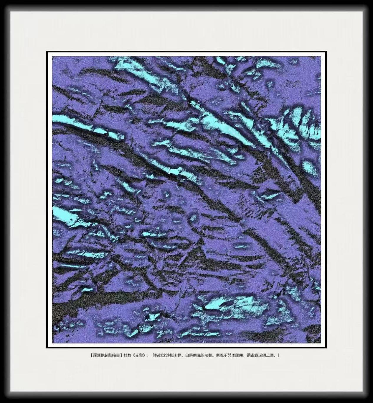 画的基底是铺天盖地的紫,像埋了千年的沙层,沉得化不开。深紫是沙层的最底层,藏着未被扰动的秘密;浅紫是沙层的表层,被时光磨得发亮,像磨洗后露出的铁戟骨;紫灰是沙与铁锈的混合,带着风化的粗粝,像赤壁江边的碎石。这些紫色不是平涂的,是叠出来的,颜料堆了又刮,刮了又叠,像沙层沉积了千年,每一层都刻着时间的年轮。青色是撒在紫色里的碎片,有的是点状的光斑,像铜绿爬过铁戟的斑点;有的是线状的裂纹,像沙粒摩擦金属的痕迹;有的是面状的斑块,像东风吹过掀起的沙浪。青色与紫色的碰撞,像冷与暖的对话,紫色是历史的厚重,青色是时间的清冷;紫色是“沈沙”的沉淀,青色是“东风”的流动。再看画面右侧的青色线条,斜斜地划过紫色基底,像东风从东北方吹来,掀起沙层的波纹,带着当年的硝烟味;左下角的青色斑块,沉在紫色里,像折戟埋在沙中的刃,闪着冷光。这些青色是历史的裂缝,刺破紫色的幕布,漏出一点当年的光,让观者想起“铜雀春深”的楼台,想起“二乔”的裙角,想起周郎的羽扇,所有被时间埋藏的细节,都在青色的碎片里活过来。