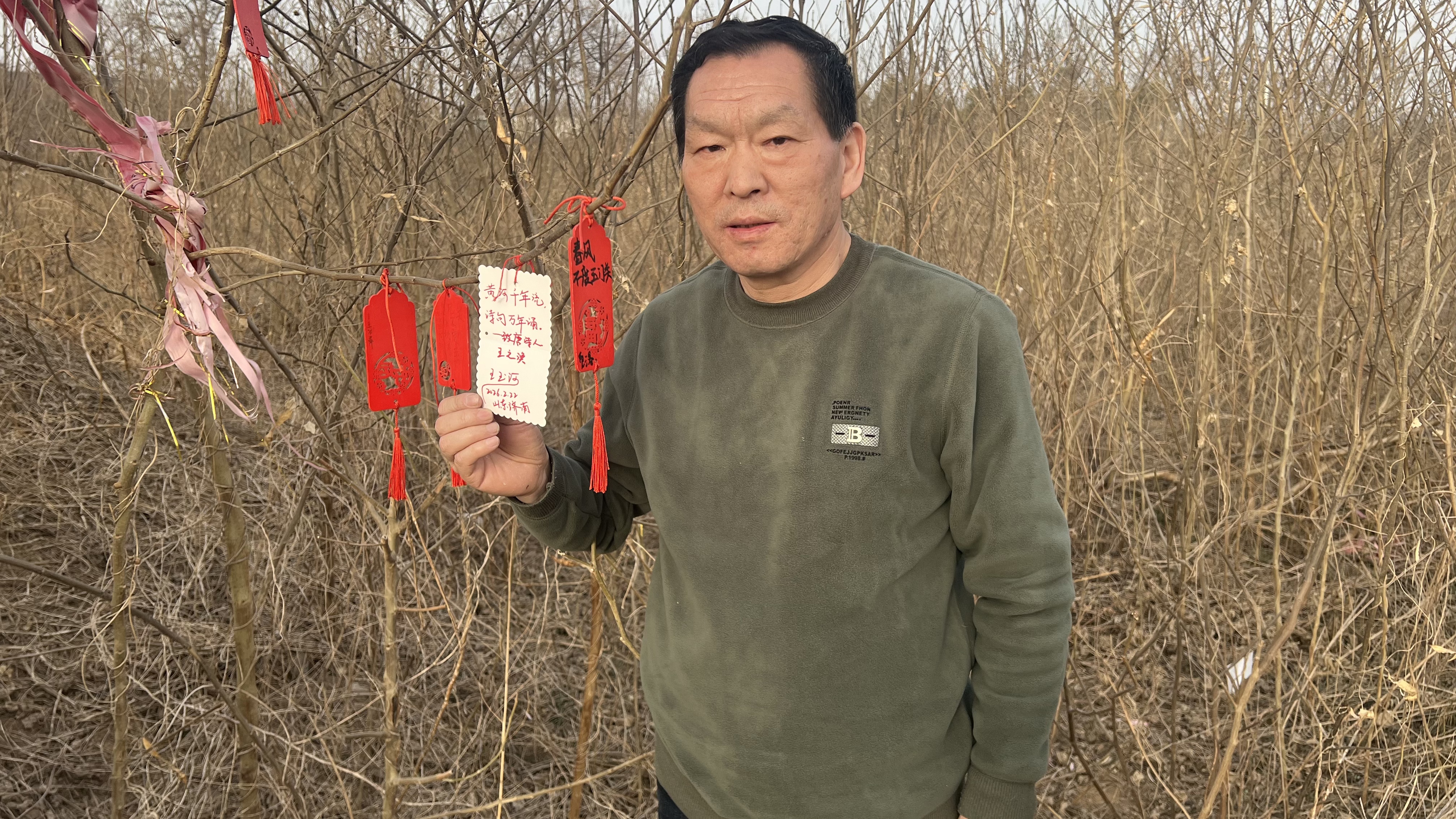 我把卡片用红线绳系在墓碑旁的小树枝上,表达我对诗人的崇敬之情。