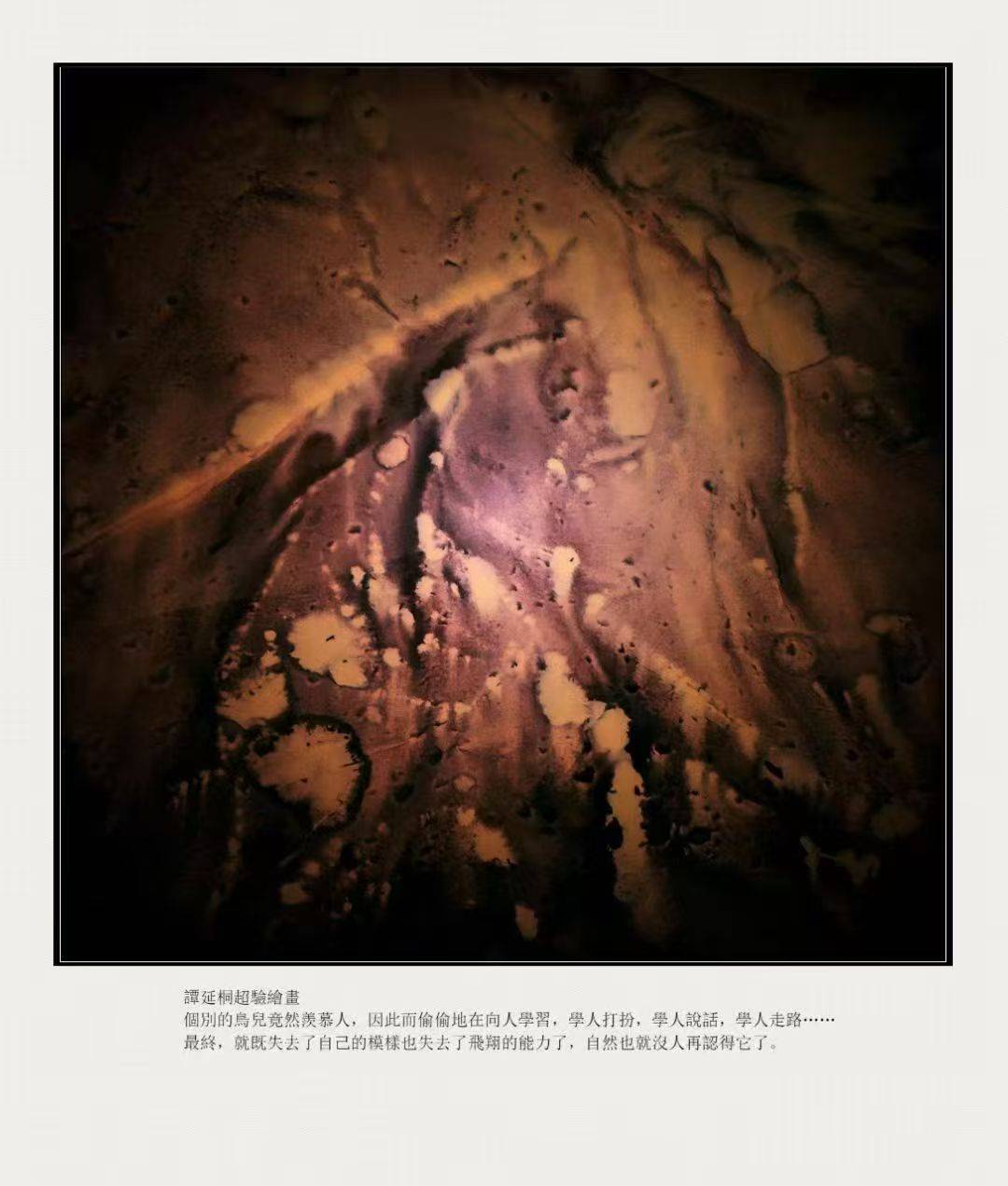 画面里的每一道笔触都在诉说失去的疼痛,泼洒的金褐是摹仿的痕迹,刮擦的白痕是自我的伤口,晕染的模糊是身份的消失。中心的淡紫光斑像一个陷阱,吸引着个体靠近,却在靠近的过程中吞噬他们的本真。边缘的混乱不是自由,是失去方向后的迷茫。鸟儿失去飞翔的能力,只能在地面无序游走,连影子都变得模糊。这种失去不是突然的,而是慢慢发生的,像时光偷走记忆、雨水侵蚀石头,直到最后,连自己都认不出自己。其实,我们每个人都是那只羡慕人的鸟儿,羡慕别人的成功,模仿别人的生活方式,强迫自己符合社会的标准,慢慢失去了自己的模样和本能。画面里的抽象是共鸣,让我们在模糊的色彩中,看见自己的影子,听见自己的心跳。当我们盯着中心的淡紫光斑,是否会想起自己曾经的“飞翔能力”?是否会害怕自己最终变成没人认得的摹本?
