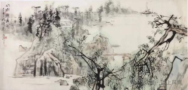 山水是先生的立身之本。他的山水取法宋元正脉,兼具北派之雄与南宗之秀,早年得黑伯龙先生苍润笔墨滋养,后又融漓江烟雨之灵秀氤氲,独创淡墨瘦线的个人风貌。其线条如折股古钗,瘦劲而有骨力;淡墨层层晕染,空灵而见气韵。笔下山水无浓艳重彩,无繁复皴擦,寥寥数笔,便勾勒出峰峦蕴藉、云烟缥缈的禅林意境。观先生山水,如读一首空山禅诗,无市井喧嚣之气,有林泉清静之境,让人于笔墨氤氲之间,体悟“天地有大美而不言”的古哲深意。