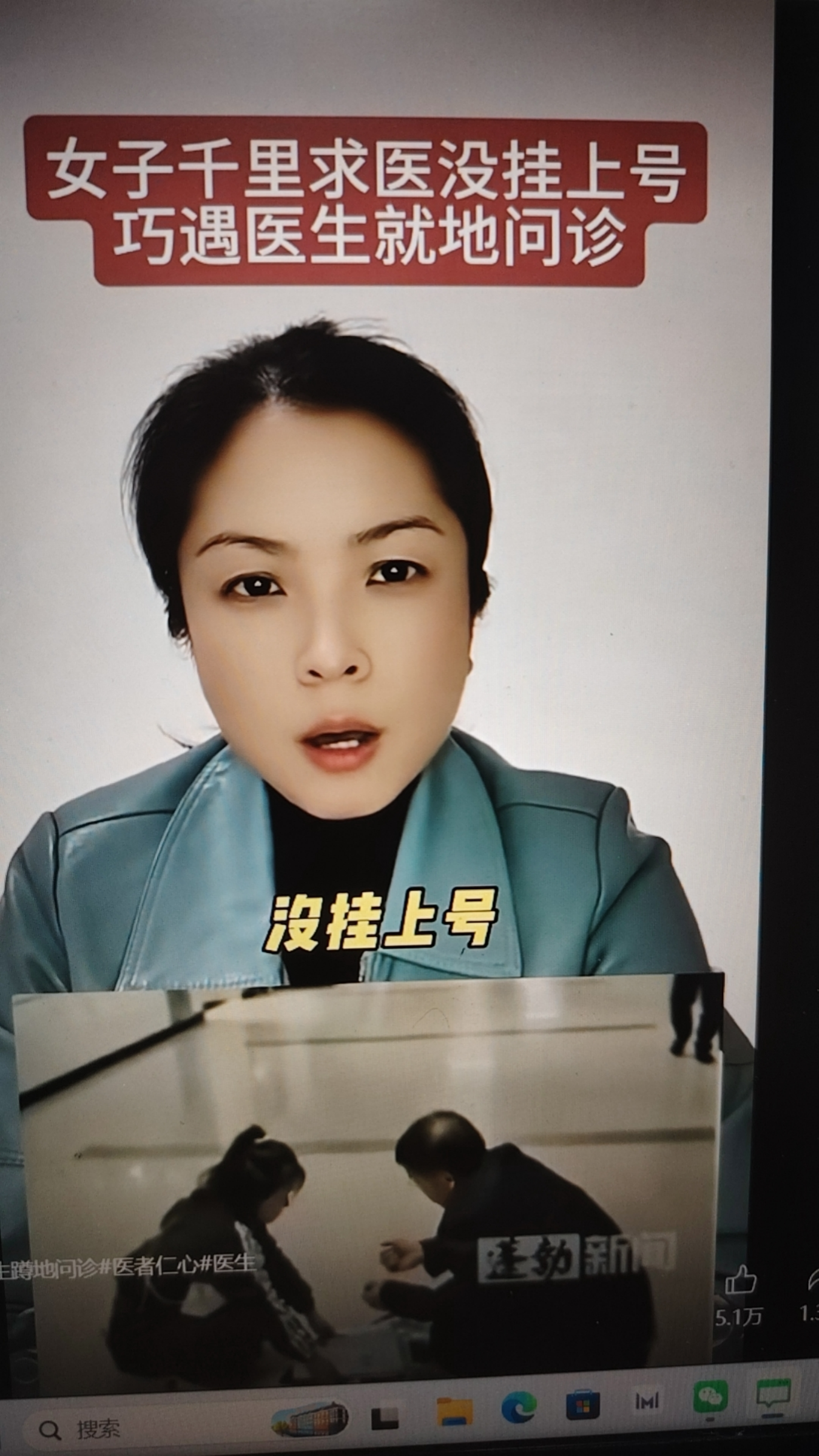 想到千里奔波的劳顿,和对未知病情的担忧,她攥着CT胶片站在走廊角落,情绪崩溃到双手止不住发抖,无助地靠墙发呆。戴继刚医生正好路过时,注意到他手中的胸外科CT胶片,就下意识地上前询问情况,得知对方跨省求医却无号可挂,他就直接将公文包放在脚边,以蹲姿借着走廊顶灯为患者阅片。这个随意一蹲,“蹲出了医者仁心,暖了全网人心”,制造了感天动地。