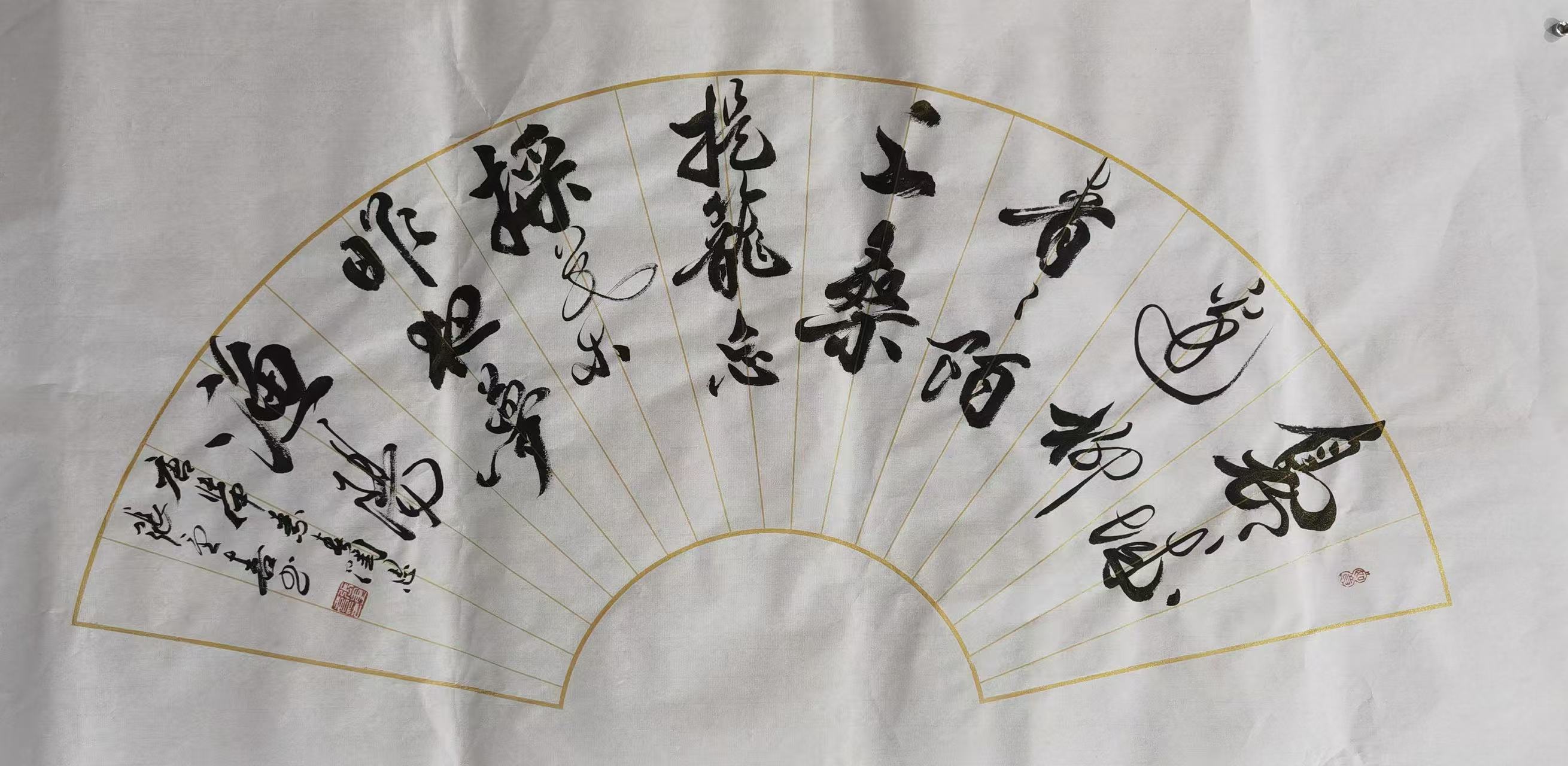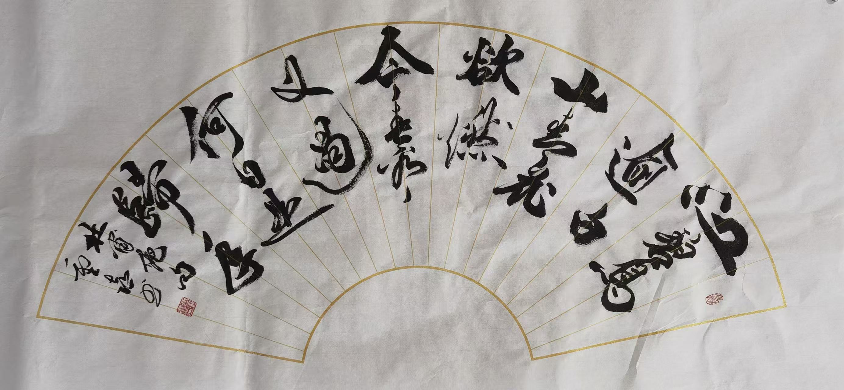 草书:法张旭、怀素,豪放磅礴,情寄笔墨。草书取法唐代张旭、怀素的狂草精髓,笔走龙蛇、气势奔放,笔墨疾徐交错、轻重交替、疏密相生,以极简线条承载极浓情感,尽显“奔蛇走虺、骤雨旋风”的豪迈气势。但他的草书并非一味狂放,而是“狂而不乱、放而有矩”,在奔放笔触中暗藏笔法法度,笔画粗细对比强烈、墨色浓淡干湿变化丰富,结体开合自如、欹正相生,既传承古典草书的自由精神,又融入当代人的情感张力与审美节奏,每一幅草书都是内心激情与艺术理性的平衡表达。