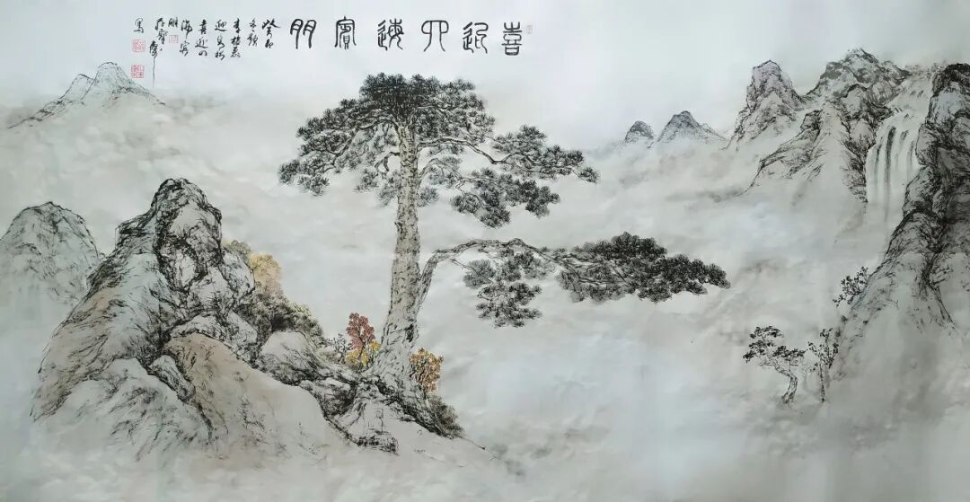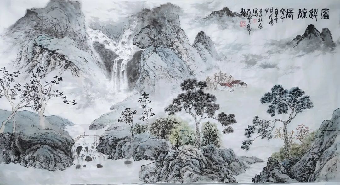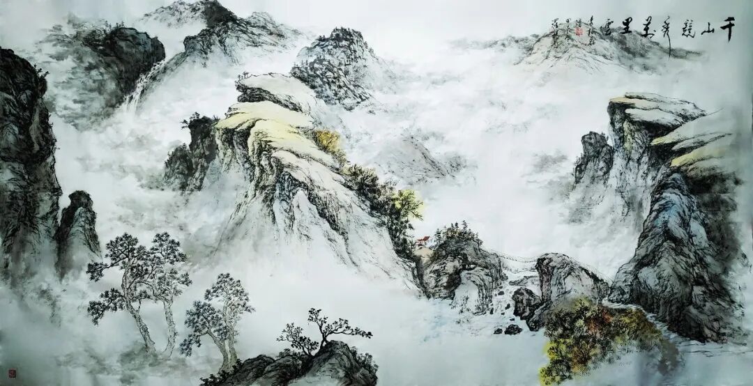 转观其山水。李拾磊的山水,取法宋元而不泥古,尤为注重画面结构的当代性转化。以《千山竞秀万里云》《江山如此多娇之长城图》为例,她不依赖传统“三远法”的常规组合,而是将山体处理为近乎几何形的块面叠压,峰峦之间以烟云、流泉作为过渡,使画面既有现代构成意识,又不失传统气韵。用墨方面,她善用积墨法,层层渲染,浓处黝黑如漆却不沉闷,淡处清透如纱却不浮薄,中间调子尤其丰富。最可称道者,是她对“虚”的处理——留白不再是简单的背景,而成为与实体山石同等重要的构成元素。那些流动的云气、幽深的谷口、朦胧的水面,既是自然物象,又是精神空间的隐喻,使画面产生“可游可居”的感染力。