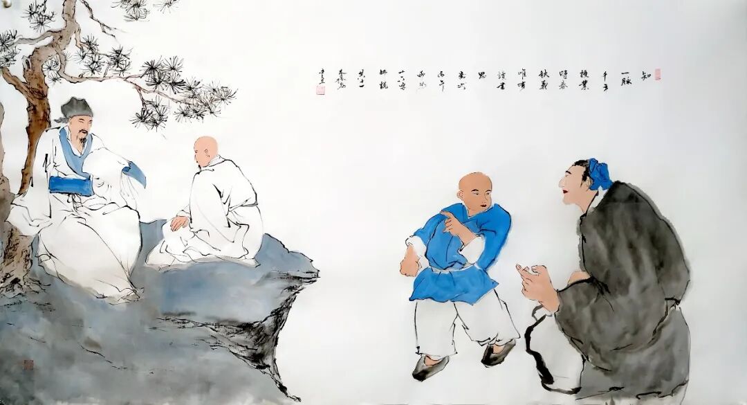 李拾磊的人物画,最见写意传神之妙。她不走工笔重彩之路,而取概括凝练的写意之法。观《渔歌子·清欢》,高士独立溪畔,衣纹仅以数根长线勾勒,起笔沉稳如锥画沙,收笔飘逸若云出岫,线条本身便带有书法的节奏韵律。她深谙“传神写照,正在阿堵中”之理,人物面部仅以淡墨略点眉眼,却神采焕然。尤为难得的是,她笔下的人物皆处于“静观”状态——或临流独坐,或松下听风,或倚杖望山,无不表意于人物的深邃内心。这种对“静”的把握,使画面产生禅修般的安定感。线条疏密之间,呼吸顺畅,人物仿佛要从纸面上走出来,与观者默然对语。
