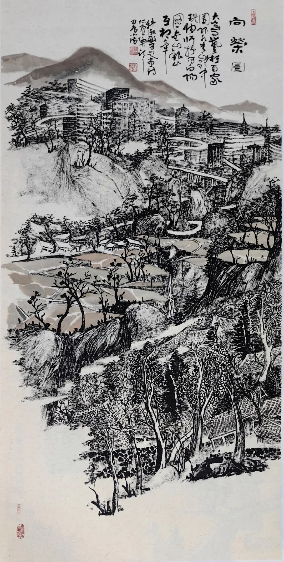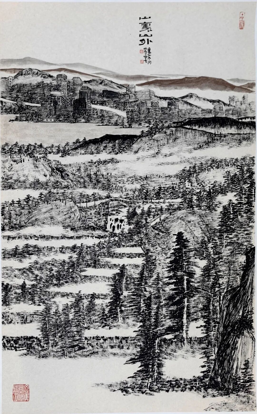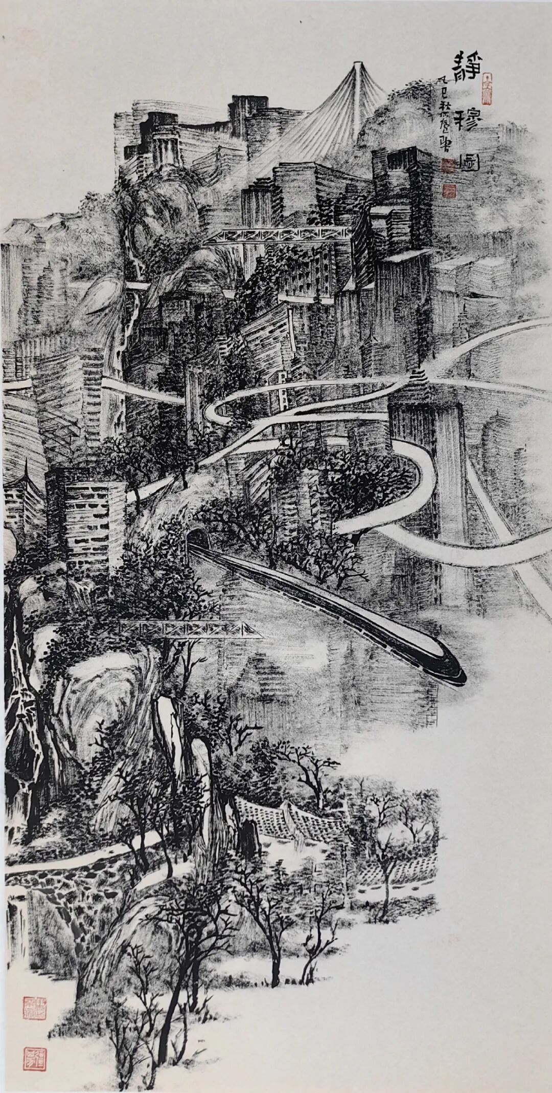 陶古的山水比较世俗,有人烟的,有村落的,从村落过渡到城镇,从城镇到城市,就到了钱学森提的“山水城市”这个概念,所以陶古在题材上填补了一般山水画家不敢碰的城镇与城市。1992年8月14日,大科学家钱学森非常关注咱们的山水画,他给我写信说,笔墨当随时代,城市都那么热闹了,笔墨能不能画城市?三十年来很多画家都在画城市,深圳有一个,东北也有一个,还有香港的一批画家。陶古画城市,从三十年历程来说,他偏后,但是,他进来以后,很执着地就画这个,我觉得很不简单,城市很难画,非常难,你要思考中国画的魅力怎么体现。