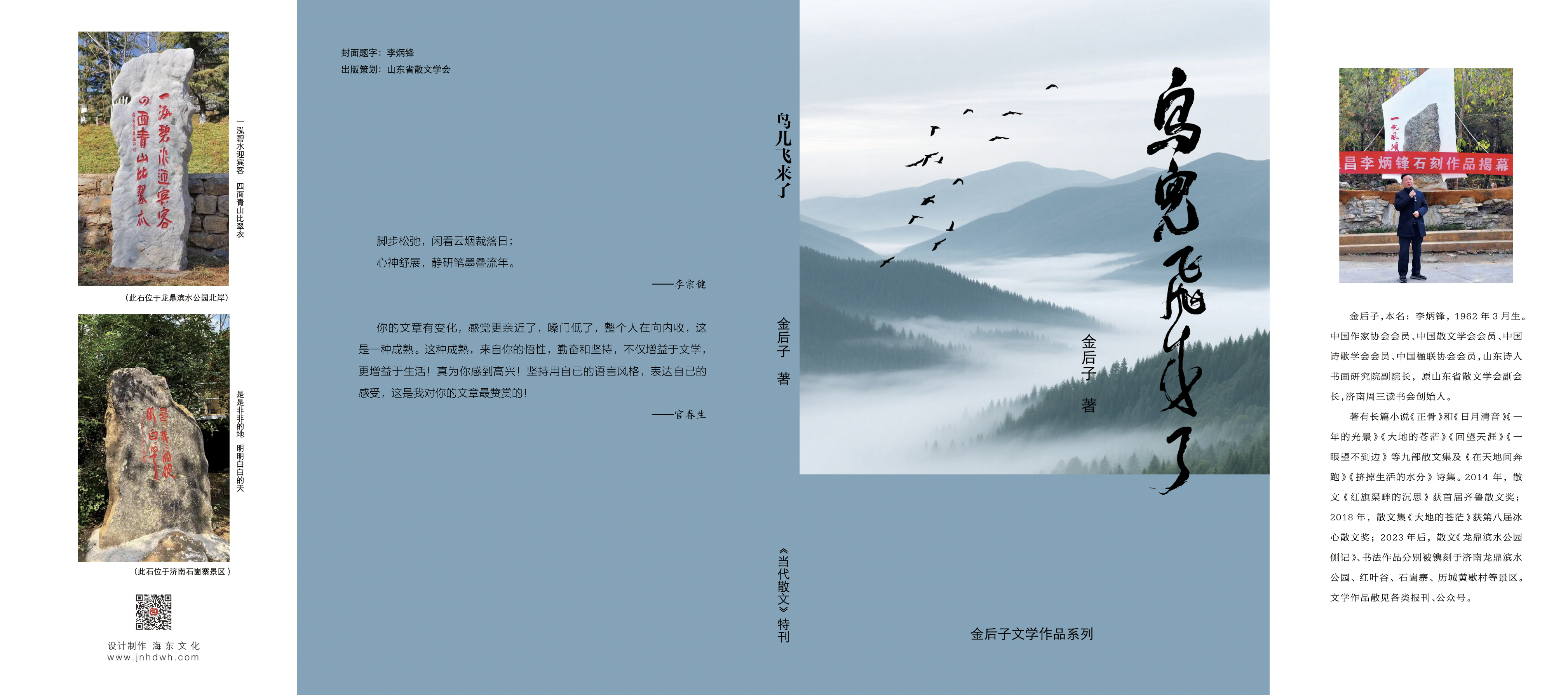 《鸟儿飞来了》一书,是李炳锋(金后子)先生创作的第11部散文集。在分享创作心得时,李炳锋表示,2025年作为创作来说是不平凡的一年。元旦那天早晨,一只鸟儿突然撞在阳台玻璃上,然后又飞走了,留下一个清晰的图案,带着疑虑,我写出《鸟儿飞来了》一文;之后,又创作并发表了散文《壮哉,韩美林》,分别被北京、济南韩美林艺术馆收藏,韩美林先生还亲笔为我签送两本画册寄来;巧遇著名画家孔维克先生,写出《幸遇孔维克先生》一文,此文竟被著名作家、原中国作协副主席黄亚洲转发;发表在《散文海外版》上的《晋中行》一文,被收入《发现大地的星星》(2025年精品集);年底创作的《4号线》被人民网转发后,引起不大不小的轰动。还有,书法作品“是是非非的地,明明白白的天”得到济南石崮寨景区认可,镌刻于景区,与著名诗人桑恒昌先生一起举行石刻作品落成仪式;题写的书法对联“读书如山厚重思想,写作似泉润泽心田”被镌刻于黄歇村的周三亭。