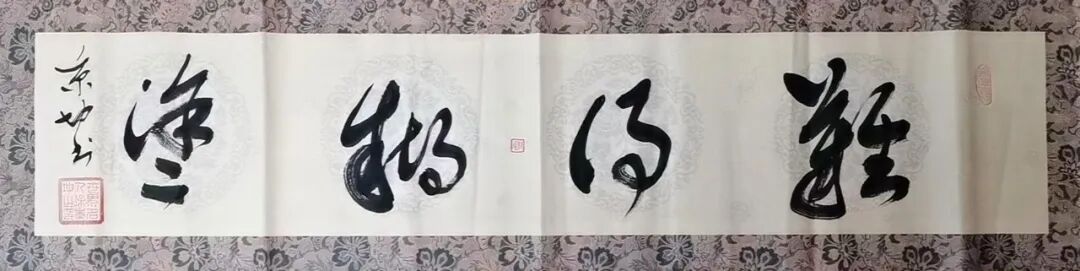 徐秉坤先生诸体兼擅,行草与楷书尤为精绝。其行草根植二王正脉,上溯汉魏雄风,下汲唐宋神采,于张旭之狂逸、怀素之纵放、米芾之爽健皆能熔为己用。观其运笔,起落如崩云坠石,使转似屈金盘铁,提按顿挫间蓄雷霆之威;点画刚柔相济,结字欹正相生、开合有度,通篇气脉畅达。其楷书深得唐楷法髓,融颜筋柳骨于一体,点画精严似庙堂礼器,结构端方如宫殿柱石,端严中不失灵动,稳健中自见风神。他以行草灵动破楷书板滞,以楷书谨严敛行草狂野,这份融通碑帖、参透书理的功力,堪称炉火纯青。