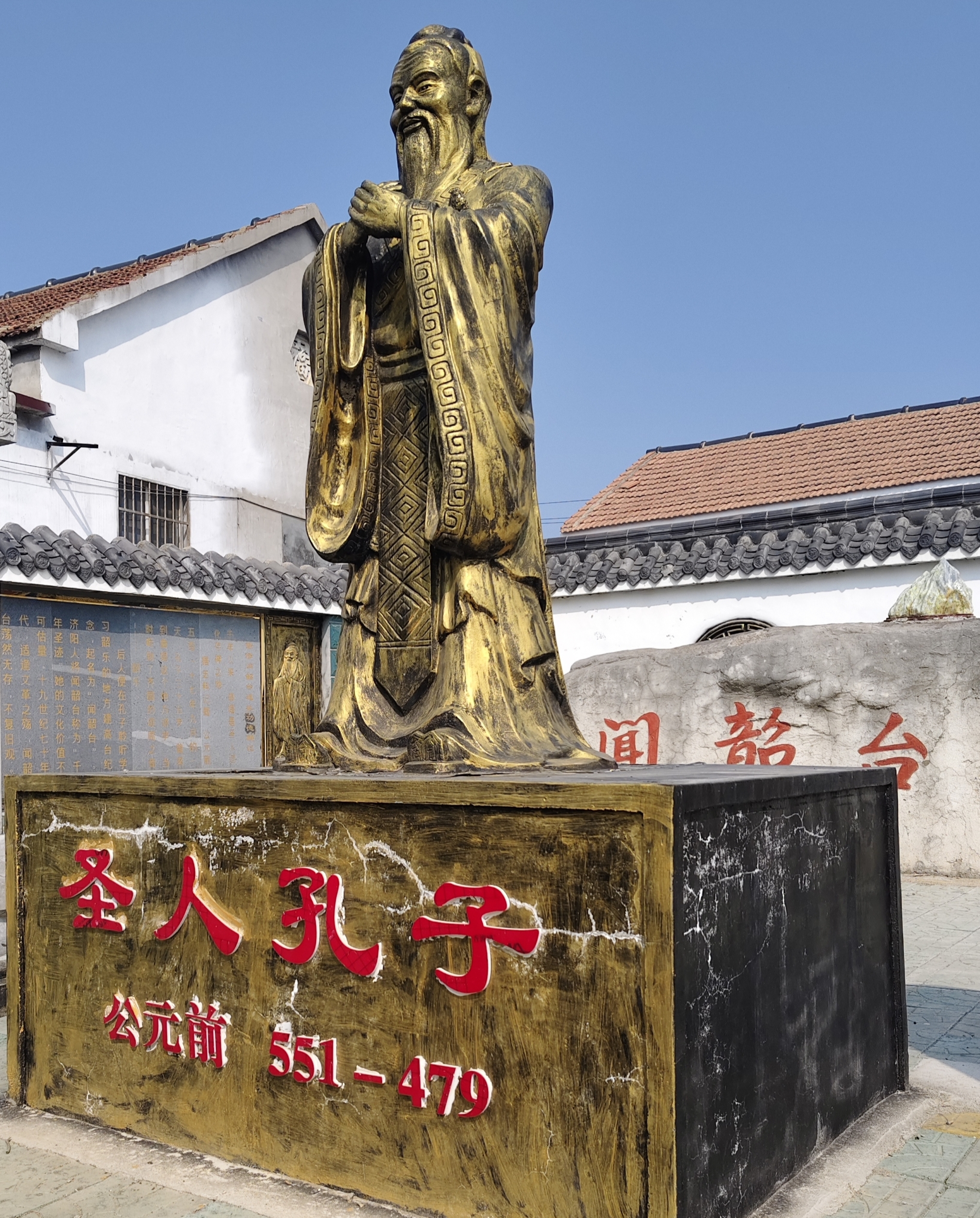 我们看到,院墙和大门都是古色古香,关于闻韶台的古今诗文、二十四孝图、闻韶台的传说等展板镶嵌在围墙上,还有孔子当年聆听韶乐的浮雕也在墙上生动浮现。院内有古朴的闻韶亭,雕刻着一副对联“玉振金声,三月独含千古味;凤仪兽舞,两阶犹动四方风”。孔子塑像,面向南方,带着儒雅与威严,两块龟驮碑上,分别是曾巩和黄庭坚题的“人仁为本”和“千古一脉”。古式的院门上,有黄铜制作的虎头扣和拉环,门两边摆放着从当年闻韶台上收藏下来的石鼓,让人看了宛如看到那个真实的闻韶台一样。闻韶台存在了一千多年,因各种原因被淹没在了历史尘埃里,但闻韶文化却一直流传在济阳这片大地上。刘宝玉自幼生长在曲堤东街,成长在闻韶台脚下,用他的话说,自己是爬着闻韶台台阶长大的。
