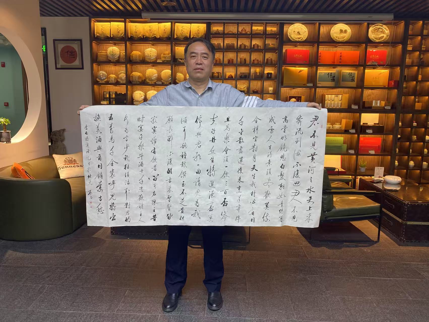 其作品既蕴含“修身、齐家、治国、平天下”的传统理想,又融入“爱国、敬业、诚信、友善”的当代价值;既坚守传统文人的高洁品格,又贴近当代大众的情感诉求与审美习惯,做到“雅俗共赏、古今融通”。面对AI技术对传统书画的冲击,他保持开放与理性,认为“AI是催化剂而非终结者”,主张以传统为基、以科技为翼,在守正创新中推动传统书法的当代传播与发展,展现出一位当代书家的文化自觉与时代担当。这种融传统情怀与时代精神于一体的心性,让其书法既有历史的厚度,又有时代的温度,真正实现“笔墨当随时代,心性映照时代”。