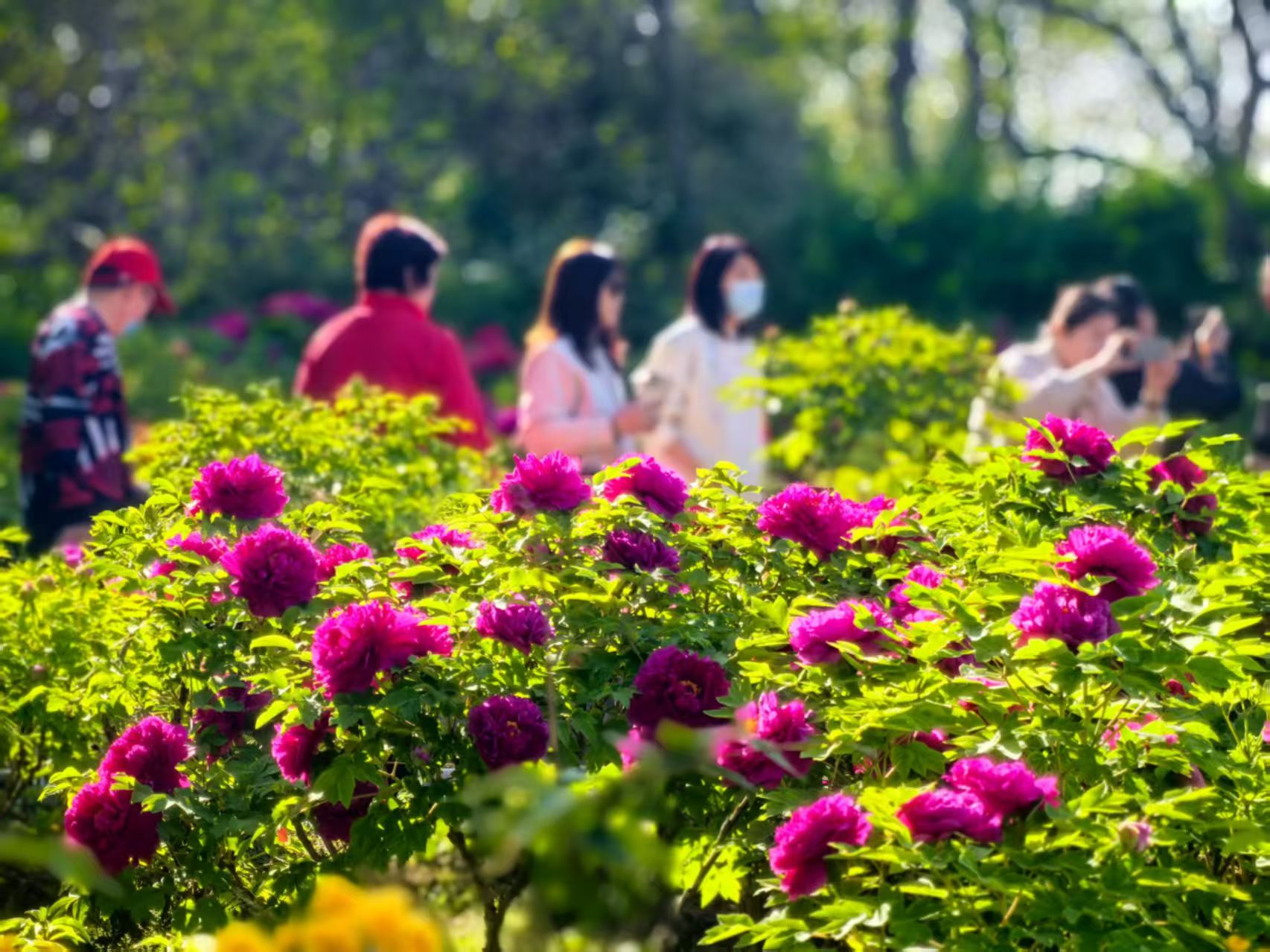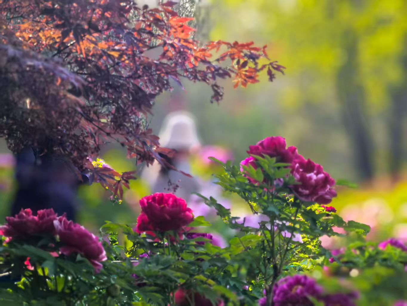 还有牵着手的老夫妻,走得极慢。老头儿背着手,老太太挽着他的胳膊,在一丛魏紫前站了很久。没有拍照,没有说话,就只是看。看了一会儿,老头儿伸手指了指花瓣边缘那一抹将谢的焦黄,老太太点了点头。我不知道他们在说什么。也许是说这花开得真好,也许是说去年的这时候也来过,也许是说腿脚不如从前了。但他们的背影很安详,像两棵并肩站了很久的树,根系已经缠在一起,不需要再说什么。