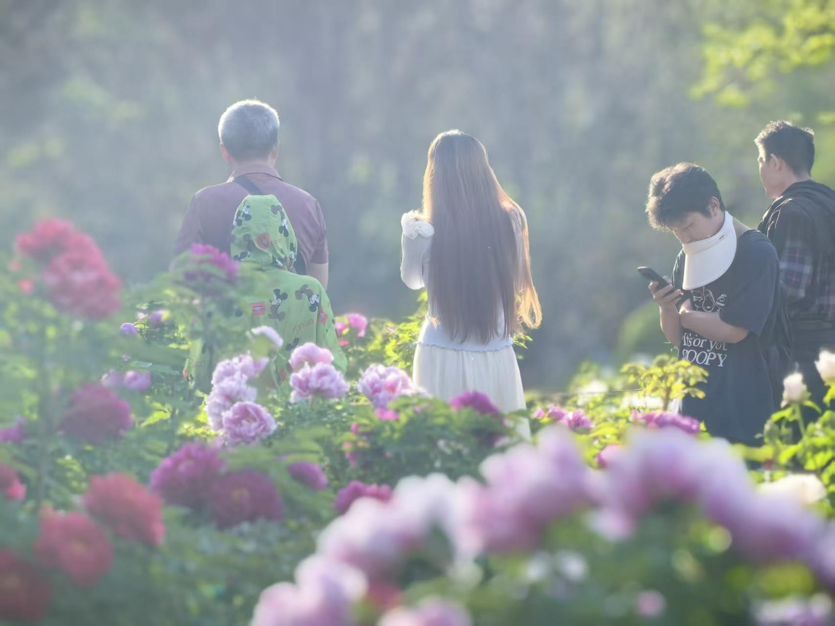 花前的人更多。取景时,看见一个女子,俯身贴近一朵魏紫。她不急着拍照,只是把脸颊凑过去,与花瓣轻轻地碰着。那样的碰触里有一种很古老的东西——像是旧时女子对镜簪花,也像母亲把脸贴上婴儿的额头。花瓣是凉的,微微有些绒,贴着肌肤的时候,人会不自觉地闭一闭眼。她后来还是拍了照,与花头碰头,笑靥如花。但那笑不是给镜头看的,是花香熏出来的,是从心底里溢出来的,藏不住的。