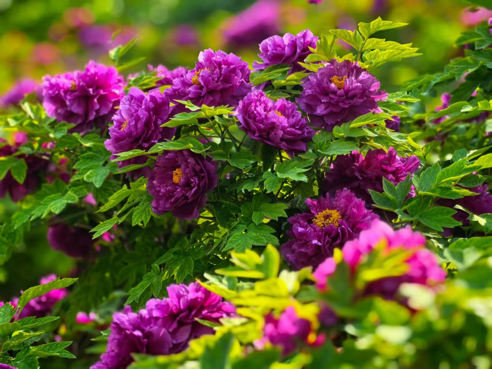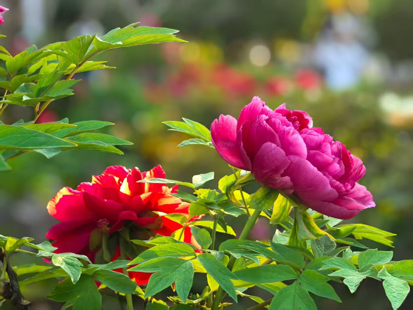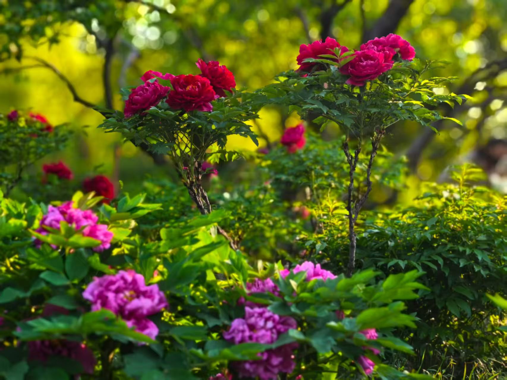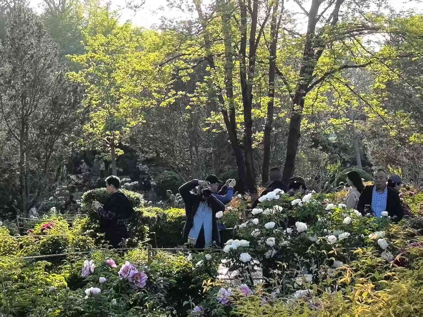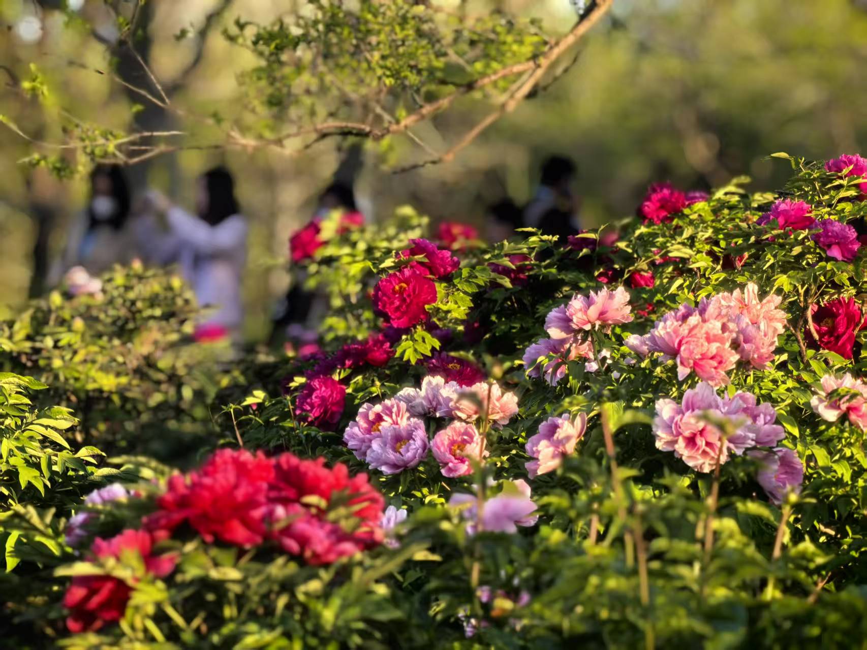 夕阳西斜的时候,光线变成了蜂蜜的颜色,从花枝间漏下来。牡丹花在逆光里变得透明起来,花瓣薄薄的,像是一层凝固的霞。人渐渐散了,花香却更浓了,大约是暮色把香气困住了,不让它走。