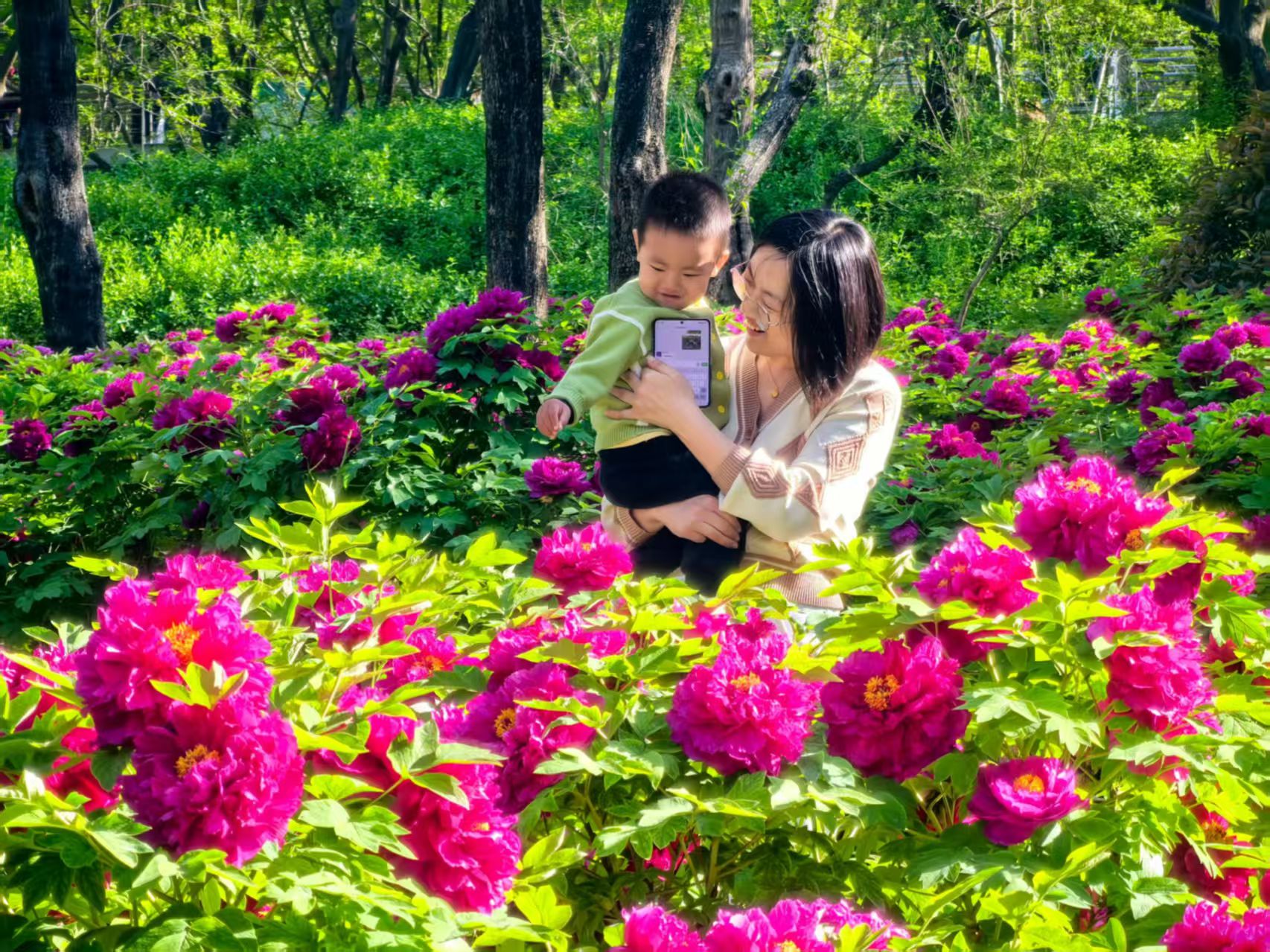 心无旁骛的拍照中,又看见一个年轻的母亲,一手抱着孩子,一手举着手机。孩子不大,大约还看不懂牡丹,只是被那浓烈的颜色惊住了,眼睛瞪得溜圆,嘴微微张着。母亲却笑得很满,那种满是一个人的欢喜装不下了,要分给怀里这个小人的样子。她举着手机转着圈地拍,不同角度,相同笑靥。那孩子的笑容和母亲的笑容叠在一起,竟比身后的牡丹还要明亮几分。