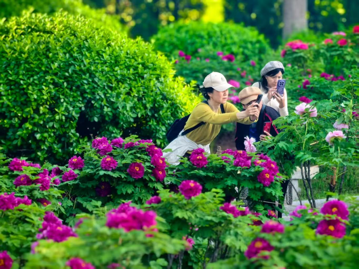 泉城公园的牡丹园不算大,与菏泽的牡丹园不是一个体量,却有着一种不管不顾的盛情。那一架架雍容,一丛丛华贵,一朵朵吉祥,是上帝打翻了的胭脂盒,是天公揉碎了的云锦缎。姚黄是熔金的落日,魏紫是凝住的晚霞,赵粉是少女腮上的羞,豆绿是春水初生的颜色。她们不像是开出来的,倒像是把一年的力气都攒着,在这一刻泼洒出来。风一过,那些花瓣便微微颤动,仿佛在说什么悄悄话。而所谓的国色天香,原不是一个形容词——那香气是有重量的,浩浩荡荡地压过来,不由分说地灌进你的领口、袖管,直往心里钻。你便觉得,整个人都被这春天泡软了。