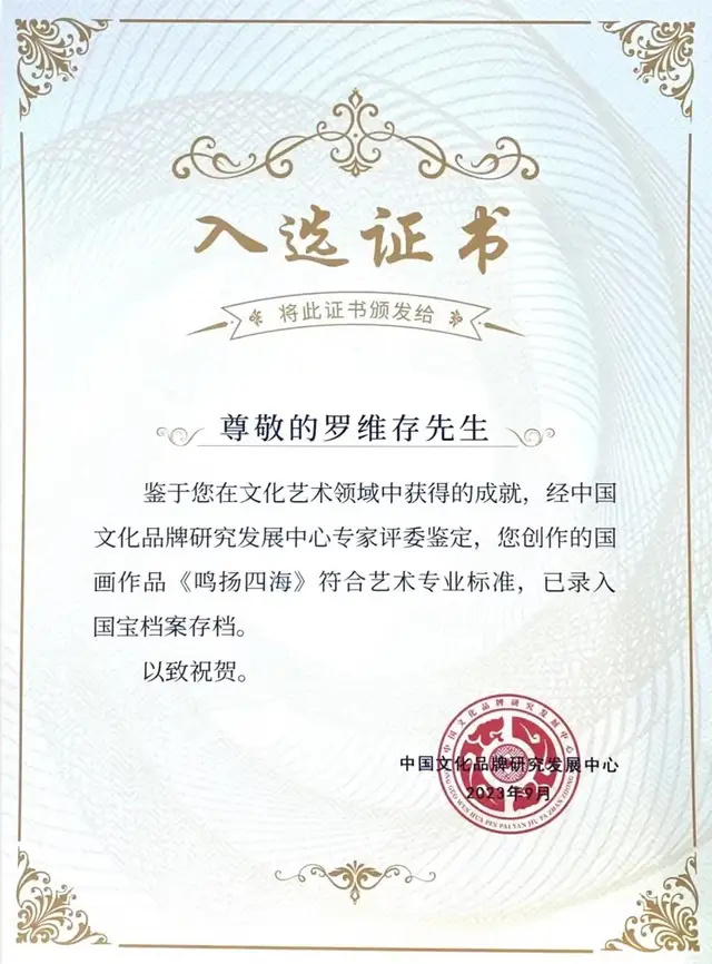 2023年9月,作品《鸣扬四海》录入国宝档案存档。2024年8月,特聘为《美丽中国》栏目组特邀导师。凤凰网、中国财富头条网、中华网、腾讯网等多家网站给予报道后,国内外诸多博物馆、美术馆及比利时、瑞典、法兰西、英国等皇家画院关注珍藏。2024年12月,特聘为亚太国际经济文化融合发展中心“终身名誉会长”。2025年3月,中视文化产业发展中心授予“美术评论家”称号。