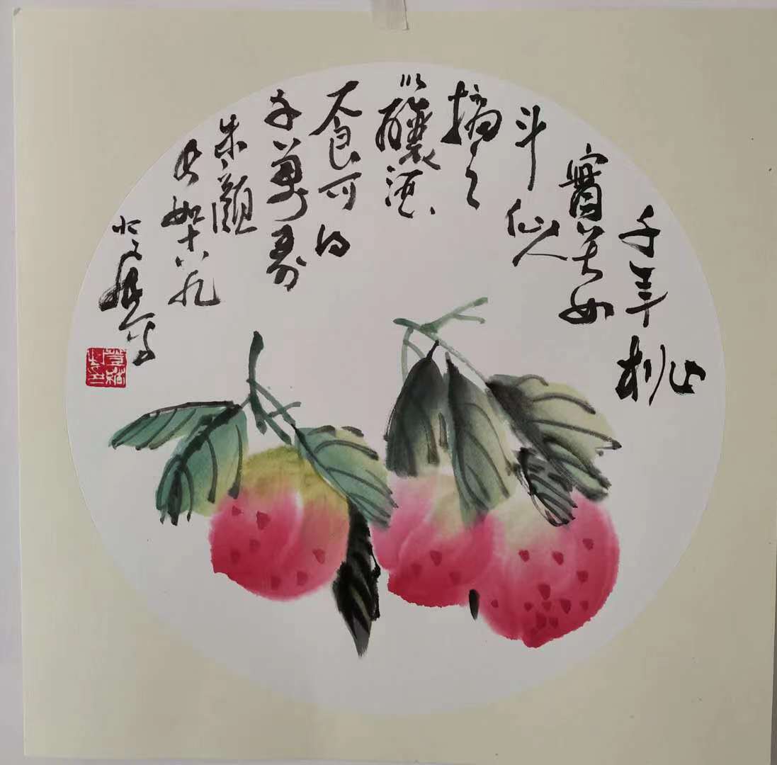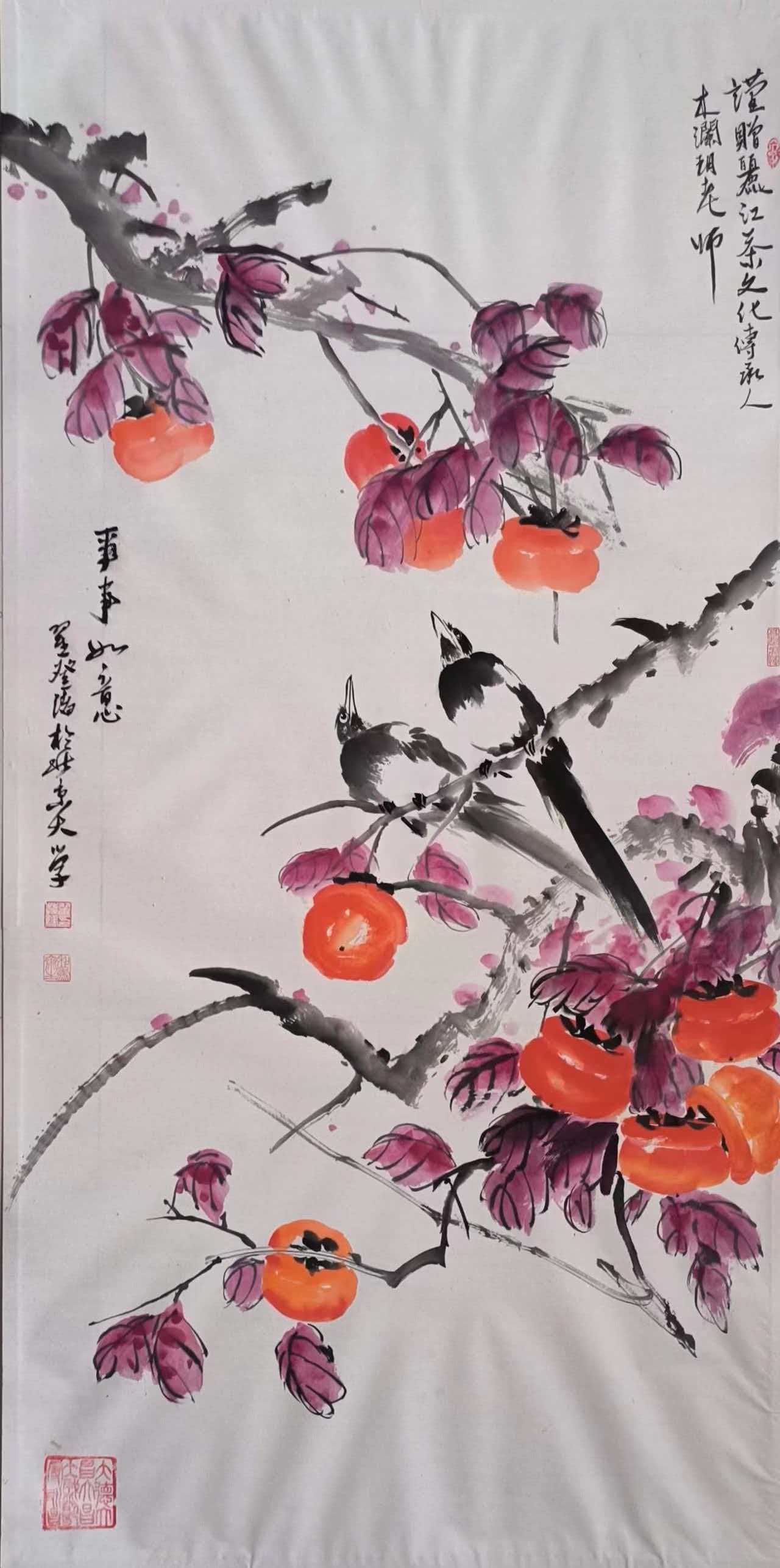 寿桃题材则彰显了翟登绪对生活的美好祝福,他的代表作《五福同寿》,以朱砂点染寿桃,墨色干湿对比强烈,桃枝以篆籀笔法写出,既有金石篆刻的苍劲,又具行草书法的灵动,画面喜庆祥和、寓意吉祥,将对生命的敬畏与对美好生活的向往融入笔墨之中,成为收藏界的热门题材,无论是个人收藏还是馈赠亲友,都是绝佳之选。
