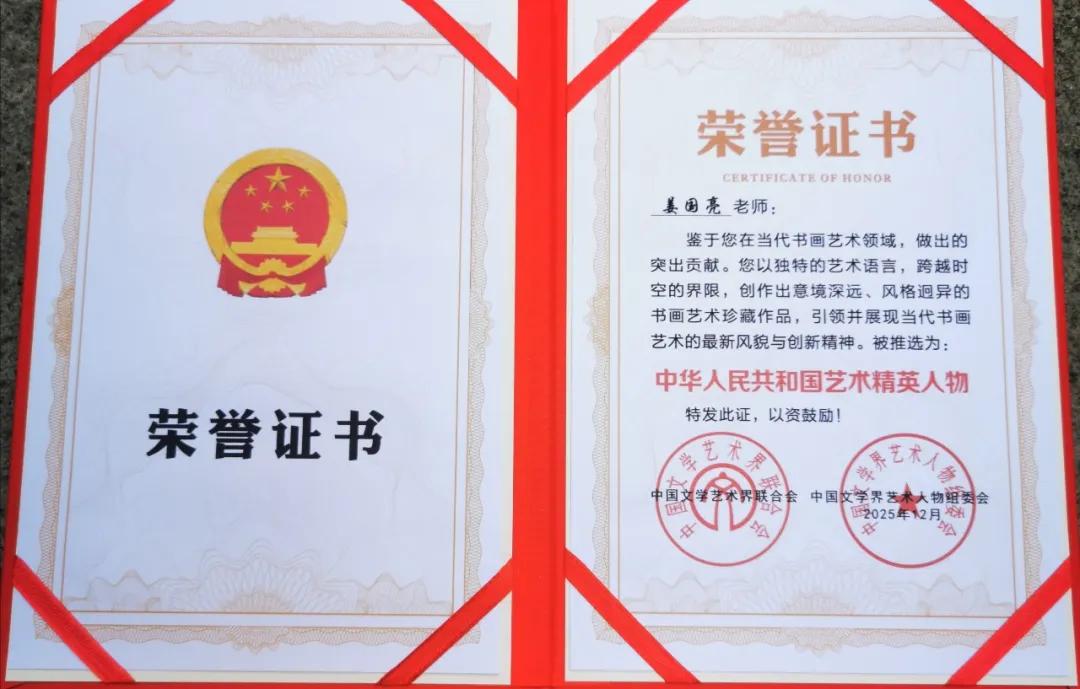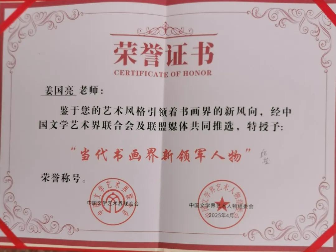 2025年被中国文联和中国文学界艺术人物组委会授予“当代书画界新领军人物”荣誉称号,同年也被全国首批文化传承人组委会、国家非物质文化遗产传承组委会授予“全国首批书画传承人”荣誉称号。同年也被中国书法家协会、中国文化艺术人才中心授予“中华国粹最具代表性艺术家”荣誉称号。同年书法作品入选中国国家图书馆举办的首届全国书画大赛,作品被中国数字图书馆颁授馆藏证书。同年也被中国文联授予“中华人民共和国艺术精英人物”荣誉称号,2026年被中国文联、中国书画名人研究会等四家单位授予“影响中国的十大艺术新闻人物”。并授予“全国十强书法家”荣誉称号。