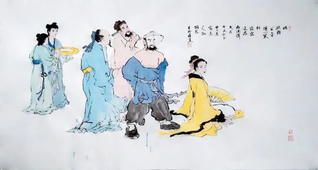 她的人物画以线为宗,以神为上,尽显线性笔墨的文人气骨。写高士,衣纹涩劲凝重,力驻纸背,不求流畅但求风骨,眉眼简淡点染,高逸之气自现;写仕女,线条柔婉含蓄,静穆端庄,配以疏竹怪石,更显素净清雅。《十六字令·巧得》其二、《忆王孙·畴昔》中人物神闲气定,文心宛然;《苍梧谣·团圆》、《苍梧谣·喧腾》则朴拙生动,烟火气中见真淳。笔下人物皆内敛自守,不事张扬,于静穆中见性情,于简逸中见品格。线条之中既有传统法度的严谨,又有个人心性的流露,凝练而深刻,形简而神全,意淡而韵长。