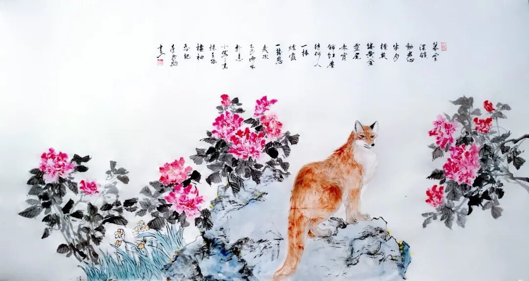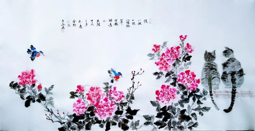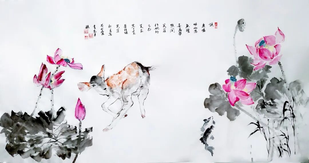 其花鸟画以简驭繁,重意兼取形,笔墨洁净而生机盎然。她不取繁复铺陈,专于提炼物象本真之态,删削多余,只留精神。荷鹿图里,荷风清雅,鹿态温驯,墨色枯润相济,动静相生,一派天趣生发;独特风格的牡丹图式则艳而不冶,华而不俗,花瓣温润、枝干苍劲,兼工带写间尽显雍容气度。画游鱼不写一水,仅凭体态转折、尾鳍摇曳,便觉清波盈纸,真正做到笔简意足、境生象外。其笔下花鸟不刻板、不俗冗,而重在抒写自然生机与文人意趣,于淡墨轻彩间流露平和冲淡的审美情怀,格调清雅脱俗。