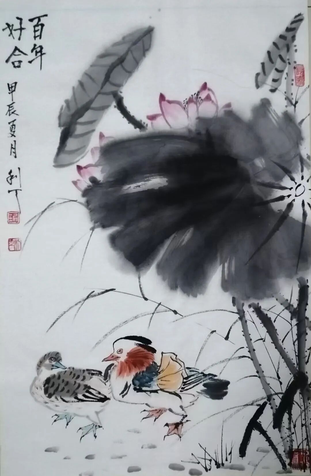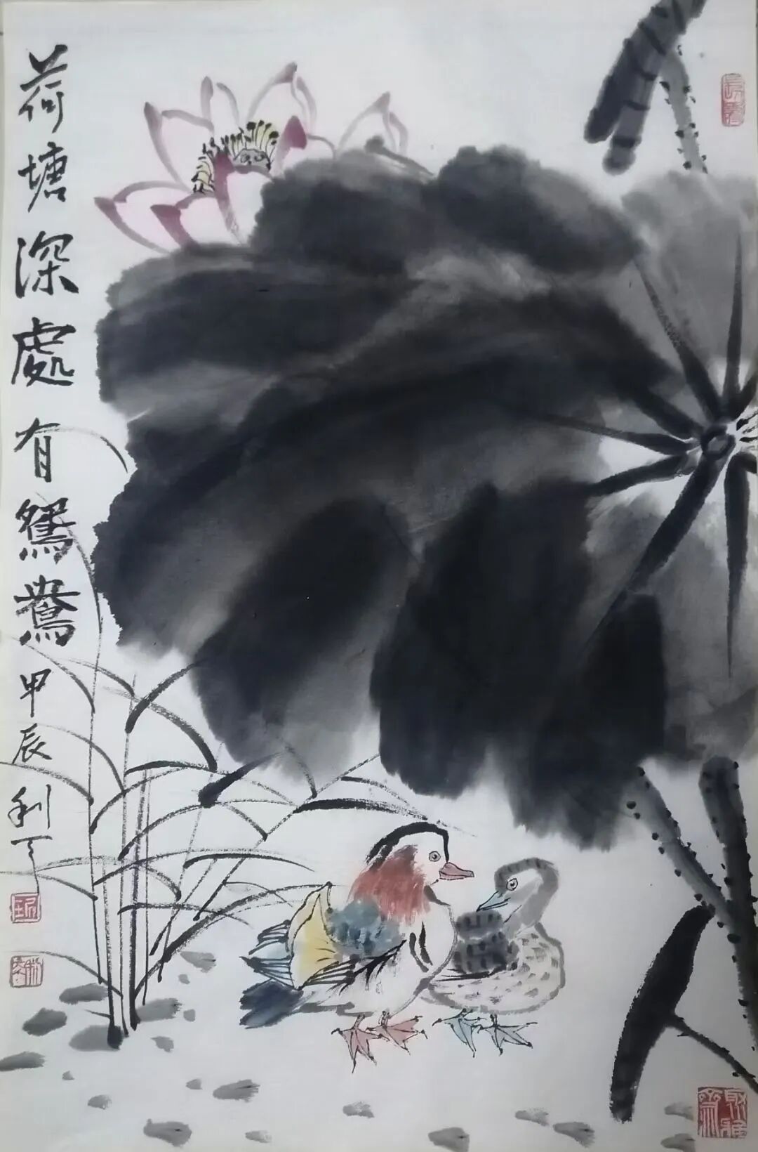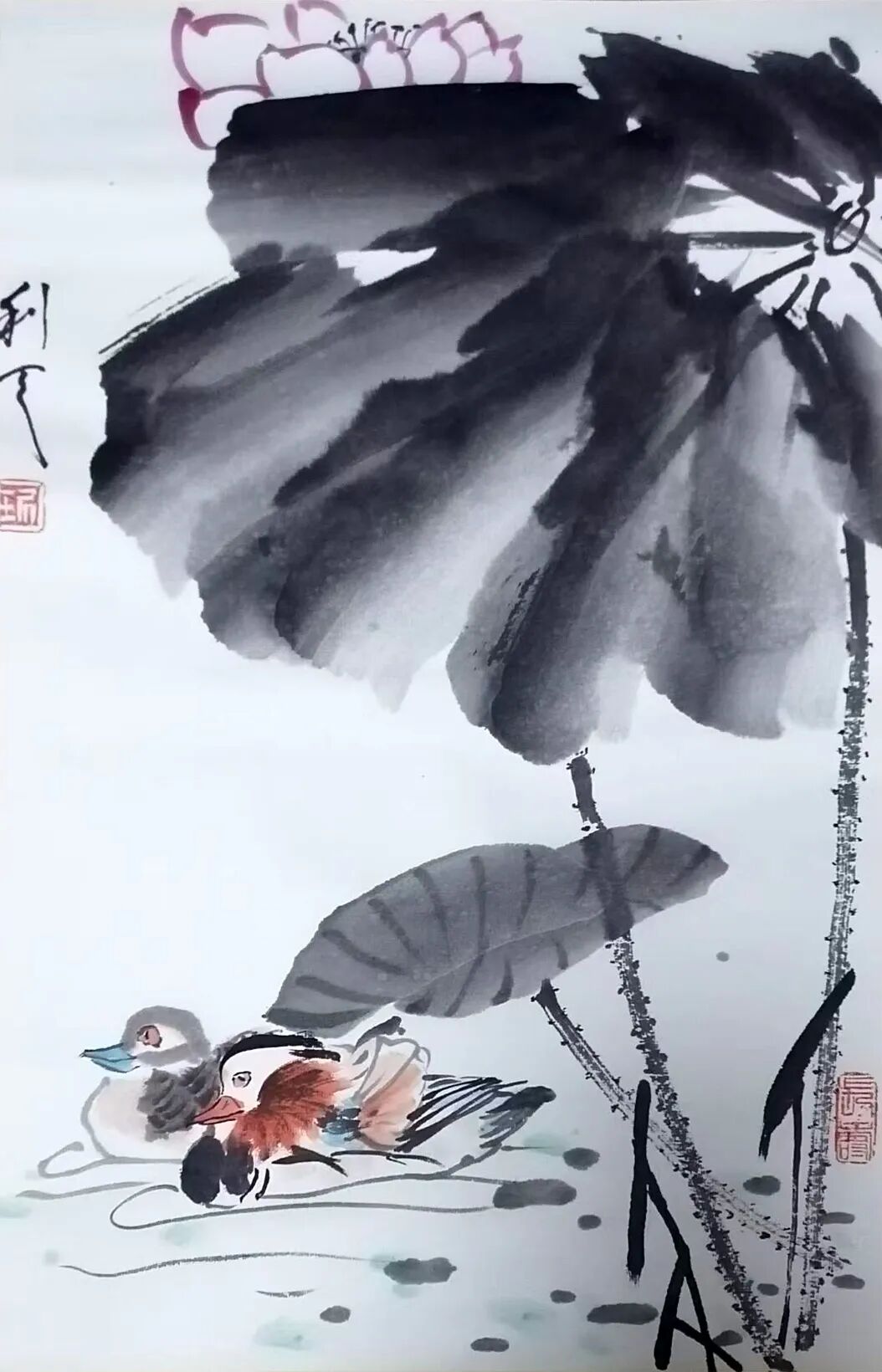 文人画以荷花为题材,荷花在千年的传承中形成了比较严谨而周全的法度范式。后人画荷花,要么过于拘束这些范式,变成了画匠。要么抛弃绕开了这些范式,成为丹青的江湖粗糙。所以面范式法度,一要吸收精华,二要有创新的才华,琚利天先生对荷花的范式法度进行了全面传承,但是不拘泥于旧法当画奴,而是有笔墨当随时代的创新动能,把荷花从一味古旧怀推向时代审美的新视野,既强调荷叶的泼墨渲染,也强调枝茎的筋骨皴擦,又点缀鸳鸯水鸟,让空间元素更为丰富,构图饱满,在景旷情疏的境界里,时时生发着接地气的审美品格。所以说他的荷花作品在构思谋断上独有智慧,是画给大众观赏的艺术珍品。笔墨意象一目了然,不但交代得清楚,而且能够让人看得明白,带着东方审美虚空舒雅的味道,干湿相兼,浓淡相宜,有道的玄妙,也有法的空相,一池荷花满眼禅韵,观赏这样的作品,恰如依柴扉听暮禅,情悠绪游。