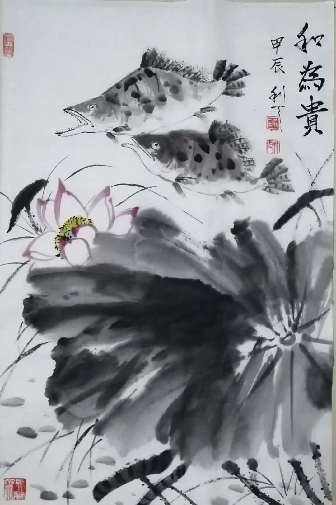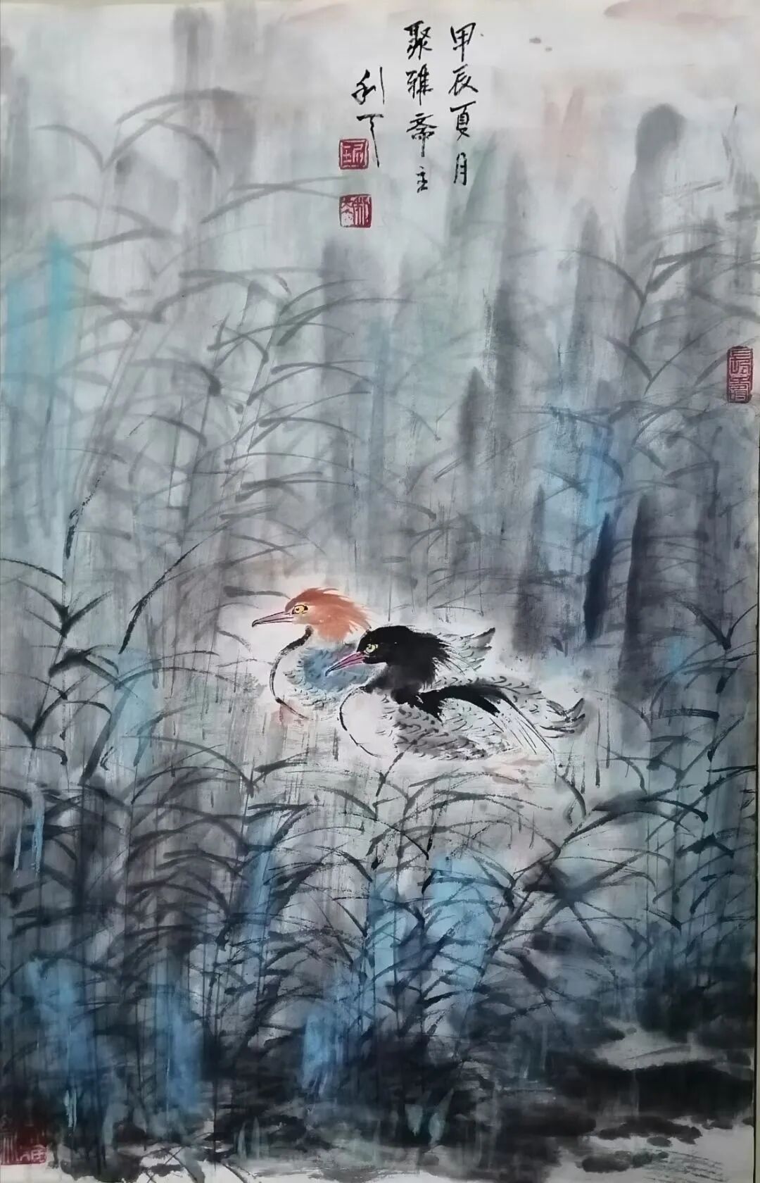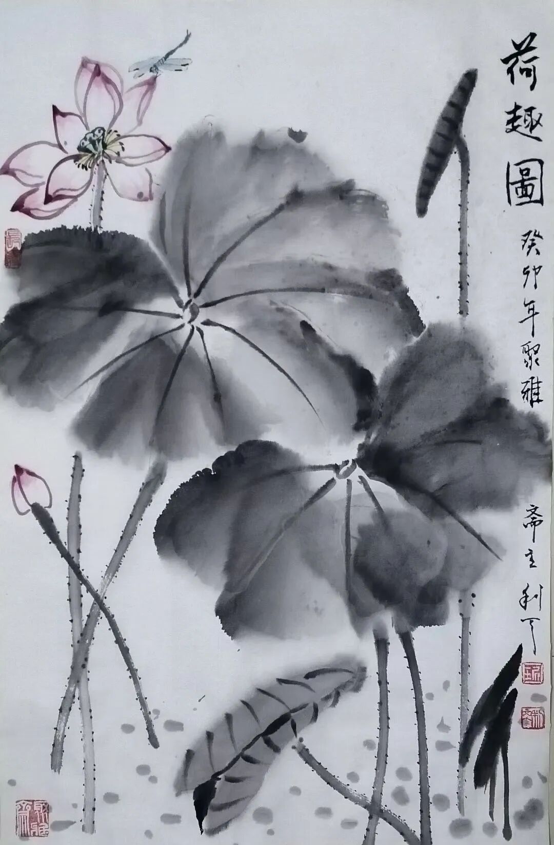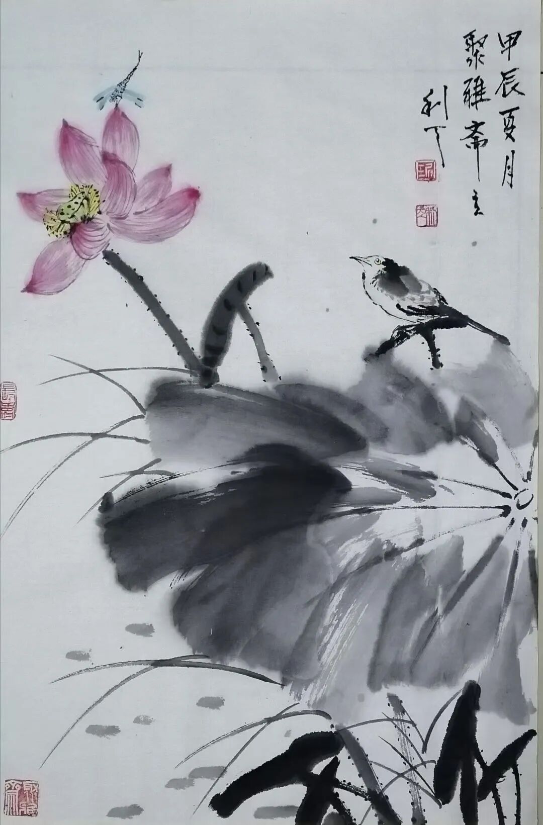 文人画以荷花为题材,荷花在千年的传承中形成了比较严谨而周全的法度范式。后人画荷花,要么过于拘束这些范式,变成了画匠。要么抛弃绕开了这些范式,成为丹青的江湖粗糙。所以面范式法度,一要吸收精华,二要有创新的才华,琚利天先生对荷花的范式法度进行了全面传承,但是不拘泥于旧法当画奴,而是有笔墨当随时代的创新动能,把荷花从一味古旧怀推向时代审美的新视野,既强调荷叶的泼墨渲染,也强调枝茎的筋骨皴擦,又点缀鸳鸯水鸟,让空间元素更为丰富,构图饱满,在景旷情疏的境界里,时时生发着接地气的审美品格。所以说他的荷花作品在构思谋断上独有智慧,是画给大众观赏的艺术珍品。笔墨意象一目了然,不但交代得清楚,而且能够让人看得明白,带着东方审美虚空舒雅的味道,干湿相兼,浓淡相宜,有道的玄妙,也有法的空相,一池荷花满眼禅韵,观赏这样的作品,恰如依柴扉听暮禅,情悠绪游。