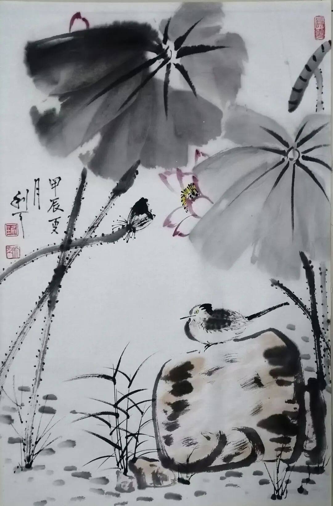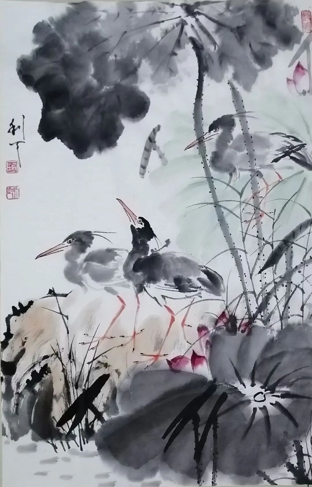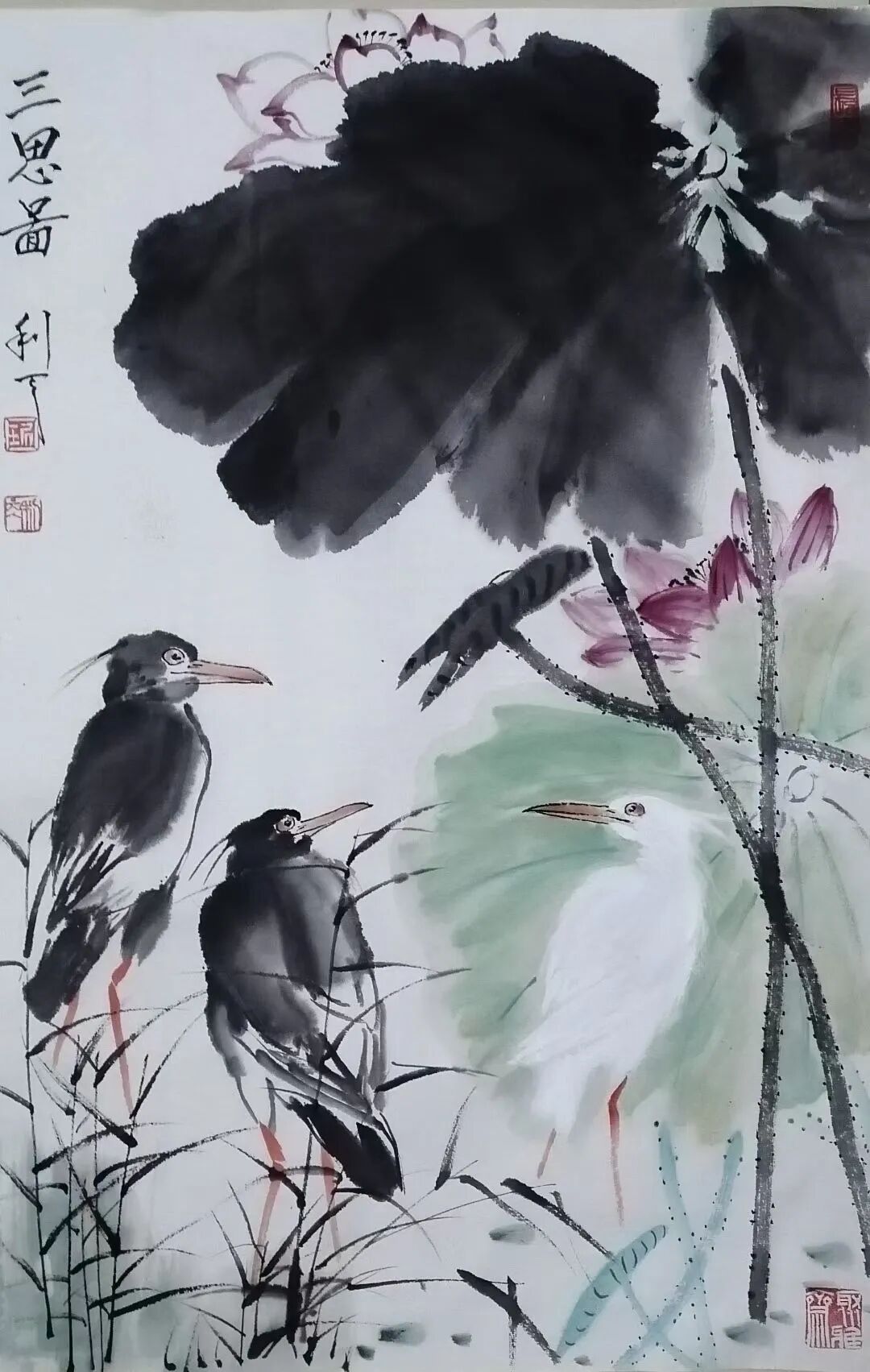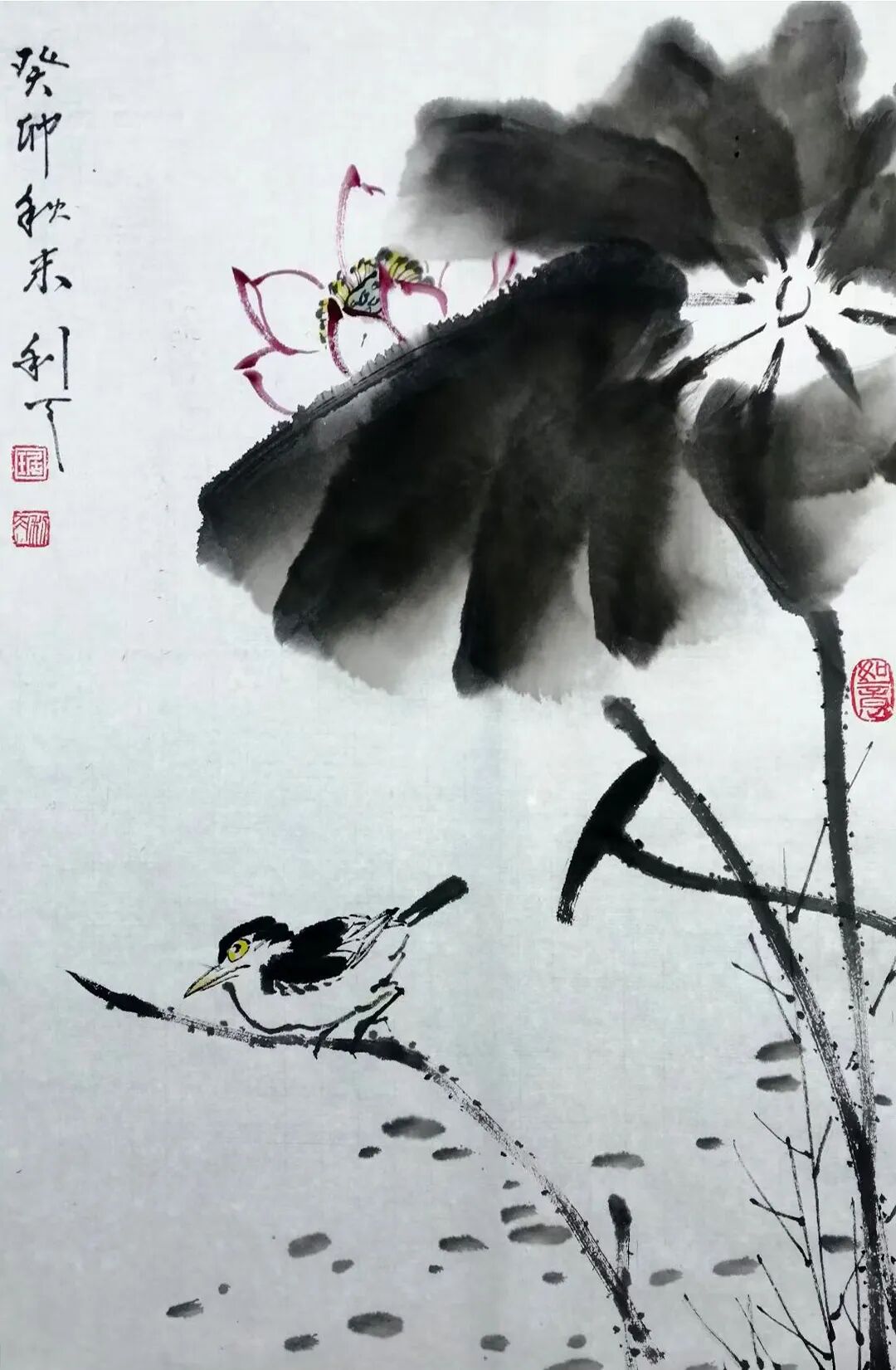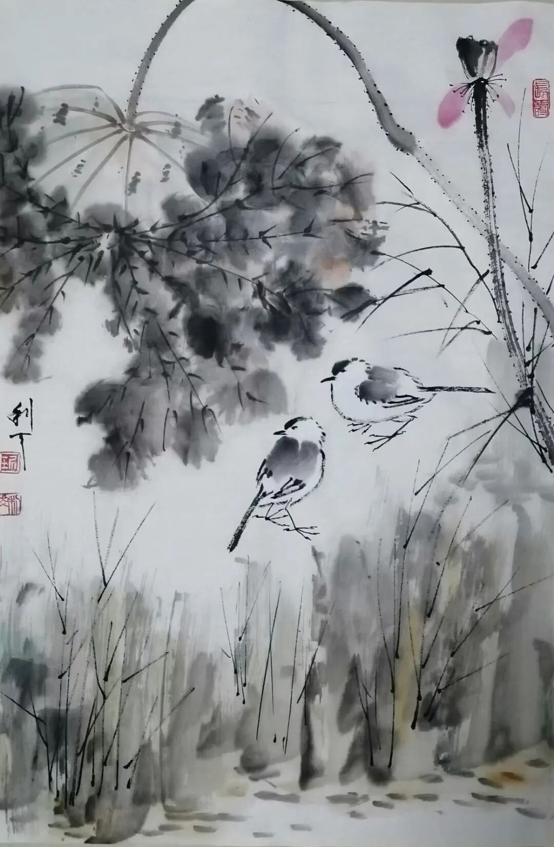绘画题材广泛,尤喜画荷。不论是夏荷茎挺叶盛花繁,还是残荷茎枯叶残花凋,均用不同笔墨或泼洒酣畅,或揉搓干湿,使之呈现出不同笔墨韵味。再配以不同禽鸟,更生出充满生气,令人神思遐想的意境,使人得到艺术熏陶和对大自然的无限热爱。