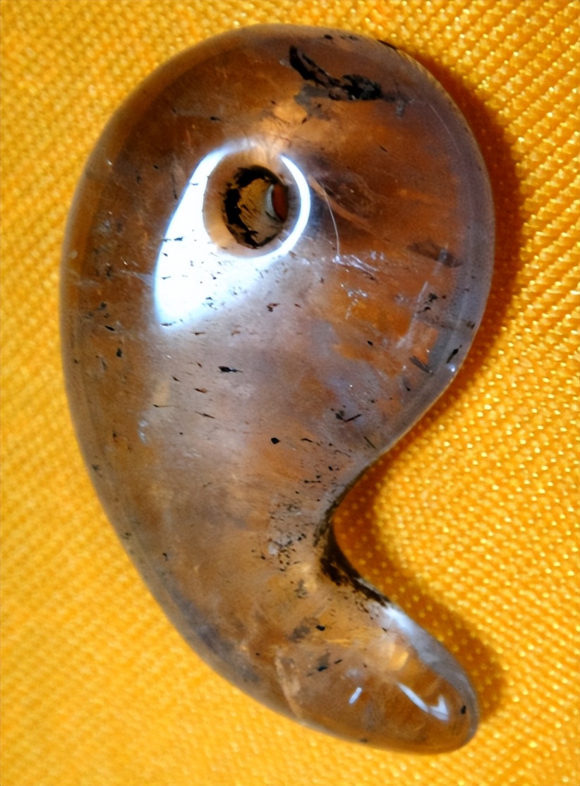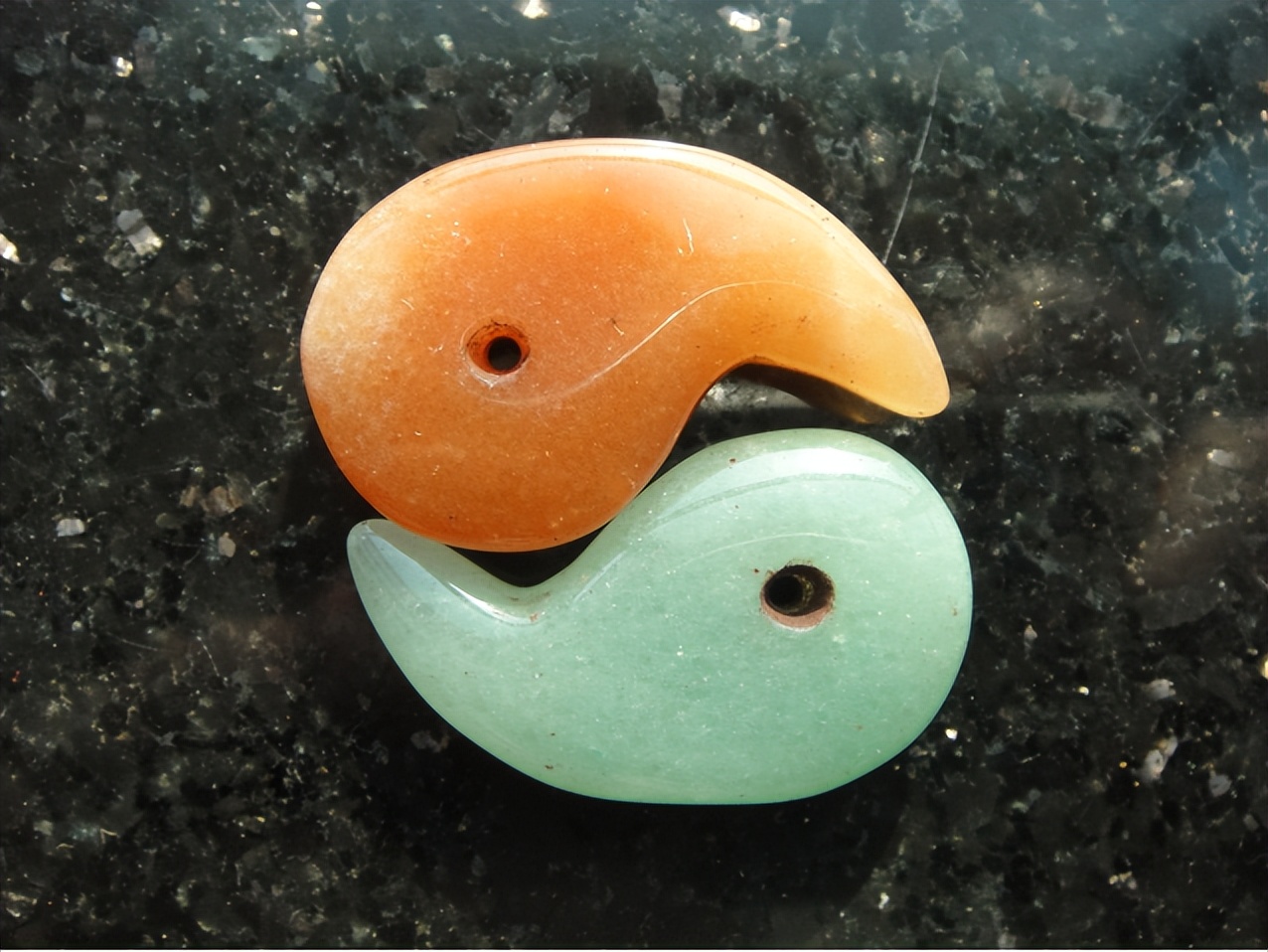 一个外形为圆,里边有一根曲线作S形平均分隔着一黑一白两条鱼的图案,即是举世闻名的中国道教太极“阴阳鱼”图。作为中国人,恐怕不知道“阴阳鱼”图者是不多的。从曲阜孔庙大成殿的梁柱,道士的道袍,到算命先生的卦摊;从中医、气功、武术及中国传统文化的书刊封面、会徽会标,到南韩国旗图案、新加坡空军机徽、……等等,太极阴阳鱼无不跃居其上。在齐国大地上发现的古代这种逗号形水晶器,恰好是太极阴阳鱼的一半,如果将两个头尾相合,就是一个完整的阴阳鱼太极图案。