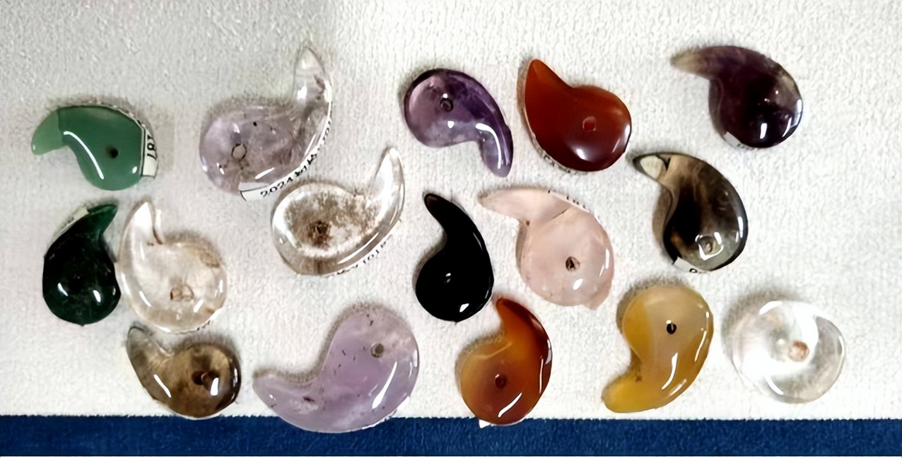 在淄川博物馆庐展室展藏的古代水晶玛瑙器中,有许多造型特别的串饰件,其中有一种被学们暂称为“豆号串饰”的器型,其形状极像是现代标点符号中的“逗号”(见下图)。