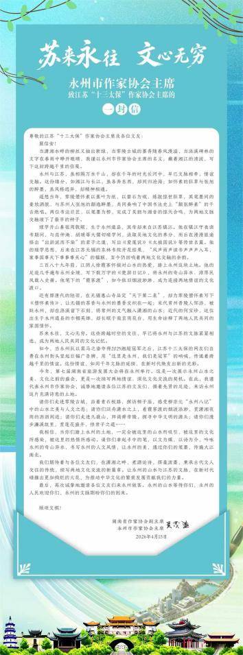当潇湘水畔的柳丝又抽出新绿,当零陵古城的墨香随春风漫溢,当浯溪碑林的文字在春雨中睁开眼睛,我谨以永州市作家协会主席的名义,蘸着湘江的清波,写下这封跨越千里的信笺。
