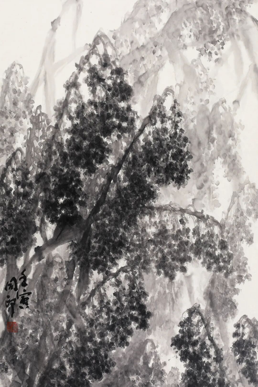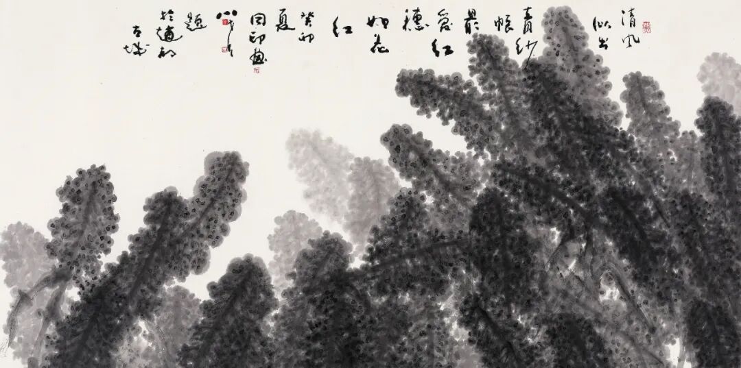 王维画论有“树要精神”一说,也是主张作为表现对象的自然事物的生命力也是需要通过一定的物象关系来体现的。艺术作品中的审美表现,同样需要借助一定的紧密结合于一定事物之间的审美关系来体现。同印长于作这种艺术——美学把握,由此形成他的作品的美感的厚重性。比如最直接的是技法方面的,继之是情感寄托,然后是生命与生命力的本体性,并以此展现画家的审美理想。