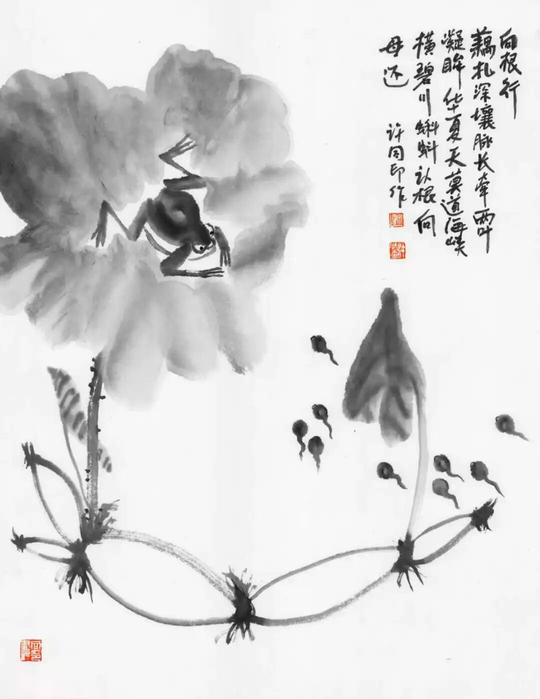 构图中突出作为审美对象的自然事物的某一具有属性美特征的具体存在形式而加以夸张、幻化,是大写意绘画的基本审美要求。朱耷的鸟,齐白石的虾,都使意象符号的表情达意达于极致。同印在向传统学习中,也有自己的时代美感与艺术领悟,于是根据构图的整体美学把握与艺术把握,努力寻找着自己的表现形式。