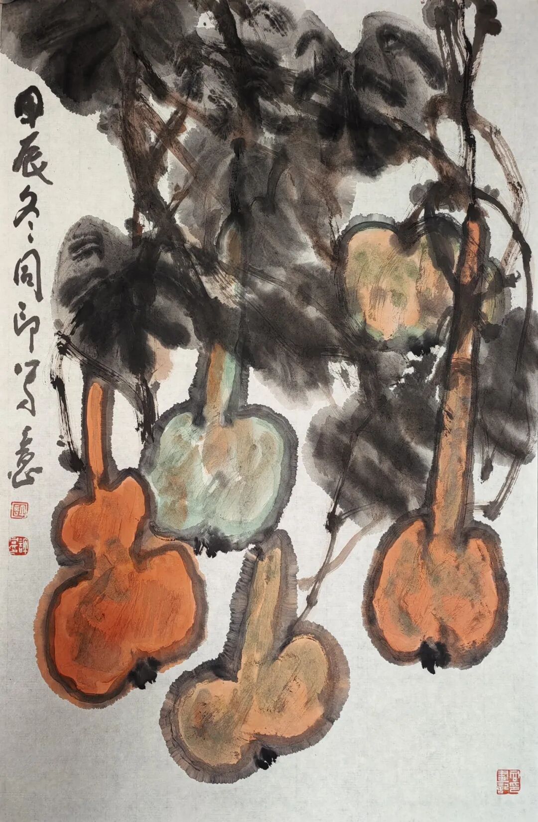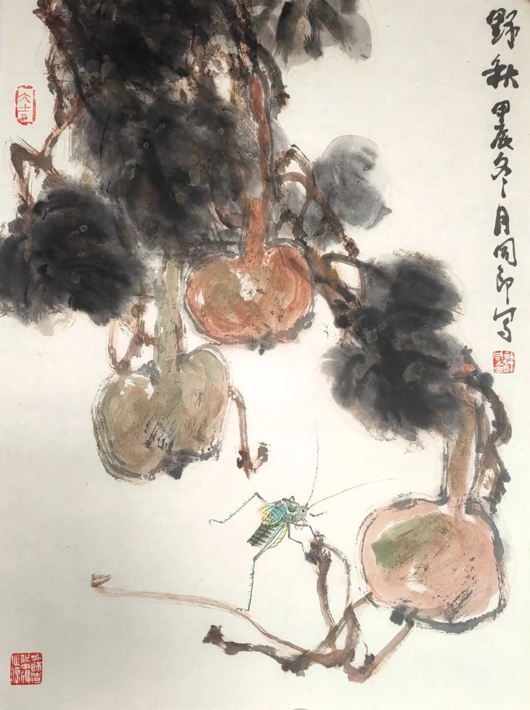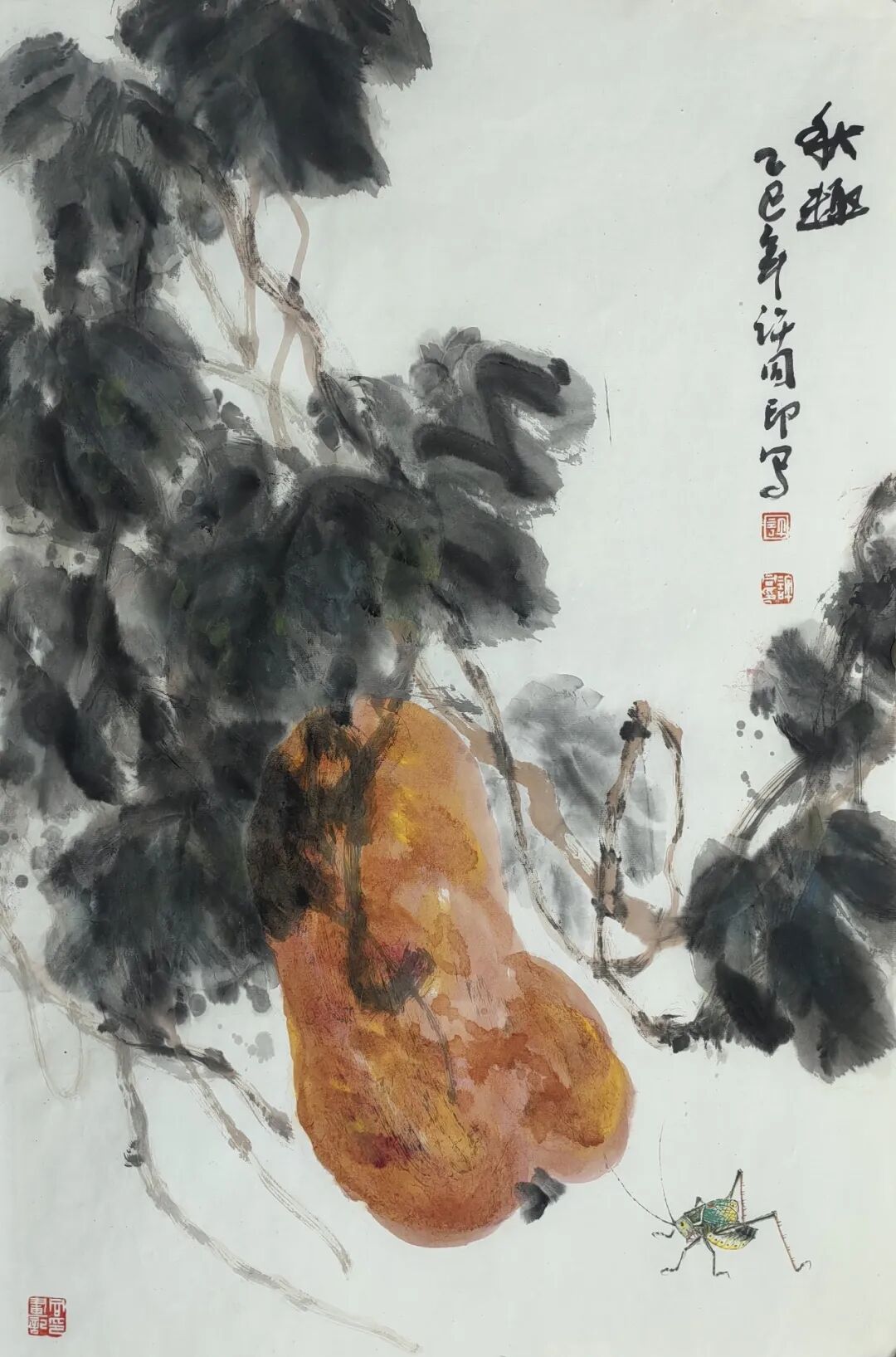 在同样题为《秋趣》的蝈蝈葫芦图中,苍劲的葫芦藤蔓,浓墨或淡墨团成的肥硕的叶片,无不流露着旺盛的生命活力。橙黄色的葫芦,以醒目而夸张的造型,突出于白与黑之间,传达着饱满而充实的秋讯。有二只蝈蝈,各择一干瘦的老枝,摇动长长的触须,一自上而下,一自下而上,信步漫游,独享秋的安闲。整体构图中,尽管蝈蝈造型较为具体,但在干墨写藤,水墨浸润的无骨叶片,以及傅彩的变体造型中,审美表现只在传达一种可供想象的审美意趣。蝈蝈的出现,也只是撩拨观者心弦的柔指一抹。而在画作《红葫芦》中,藤的缠绕,叶的重叠,映衬着充满审美意趣的幻化了的葫芦造型。