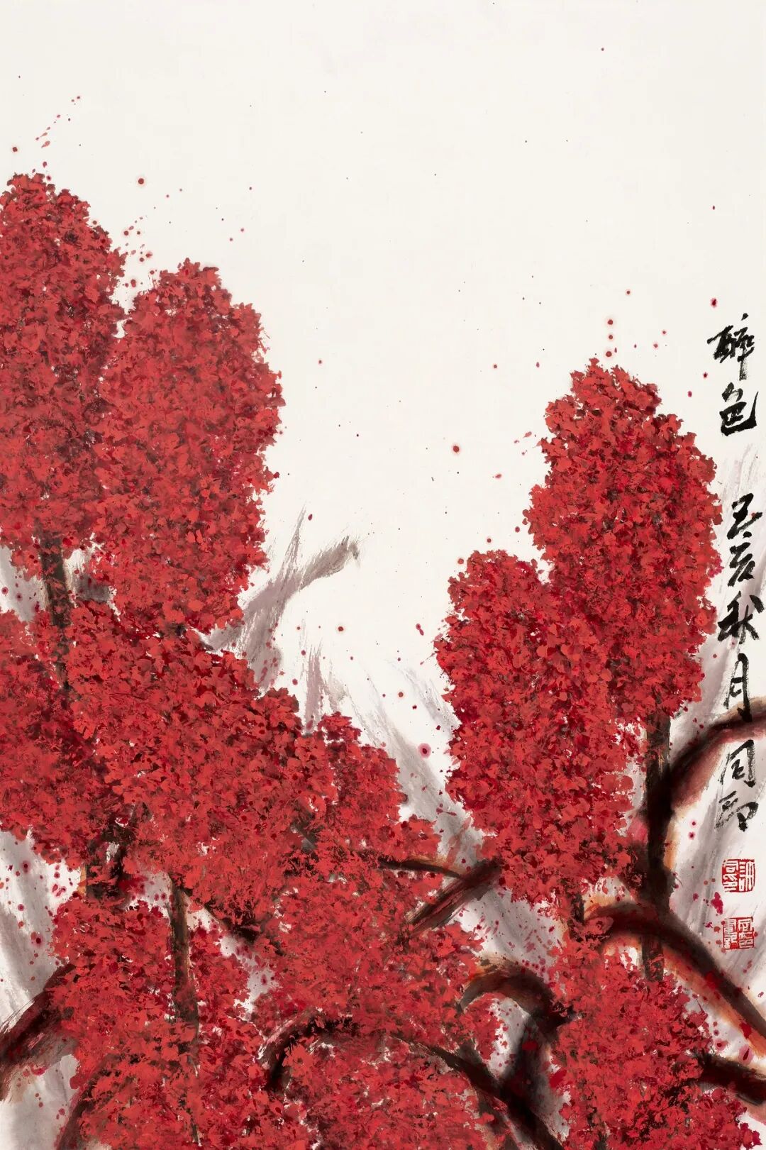 同印的山水之作,那是很有灵气与灵性的。尽管构图上多取近景,山势兀起,横空出世,笔立万仞,体态雄伟,等等。但作者画笔淡扫,留出空间,张大审美视野,以引天外清气入景入画,遂取灵动气韵贯注。所以,同印山水,格调清新秀丽,温润隽美。如《金秋》、《西坡秋色》、《太行野秋》诸作,虽山峦重叠,巨石磷峋,崖陡树深,然笔气畅达,墨无沉滞。再有《雨后满目清凉》、《霜染秋色醉》等,于崇山峻岭间更留出一片空白给远山远景远天,乃使画面由近景的挺拔险绝而至中景的渐趋渐远,再至涳濛中远山与远天的开阔与豁亮,形成审美的层次感与审美的空间感。