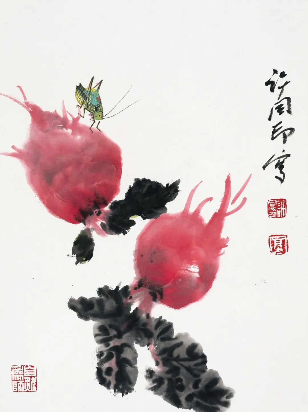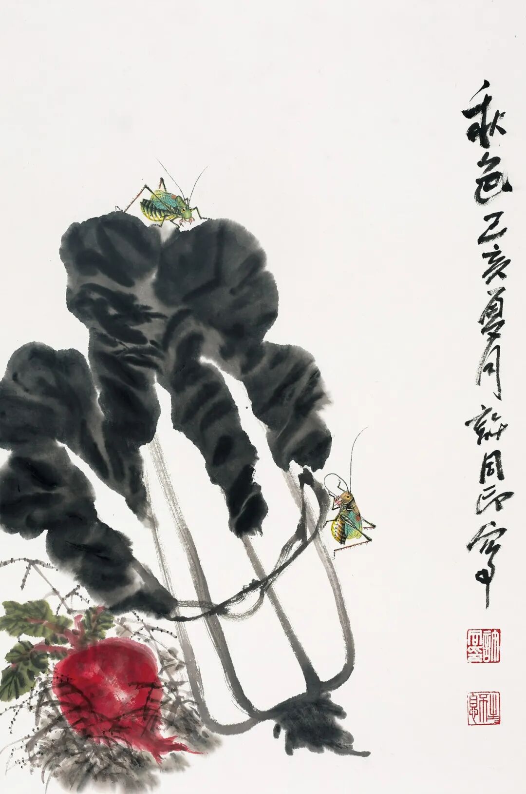 同印作品,创造形式美与尊重形式美原则及形式美规律是一致的。《秋趣》中,蔓菁的红的鲜亮浓郁的块茎斜向上方,而墨绿的茎叶则位于下方,构成一个自左上而右下倾斜的三角形构图,而另一个蔓菁的造型则取意相反,且茎叶少而块茎大,构成自右上向左下倾斜的倒置的又一个三角形构图。而两个局部三角形构图又在色彩与形状的审美关联、关系上结构成一个审美整体。更有一只十分知趣的蝈蝈又爬在最上红色块茎的顶部,这又构成了形式感审美因素的交替变化,也构成了审美形式的节律感、节奏感与构图的稳定感。