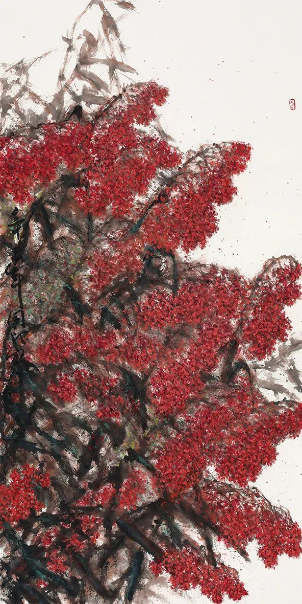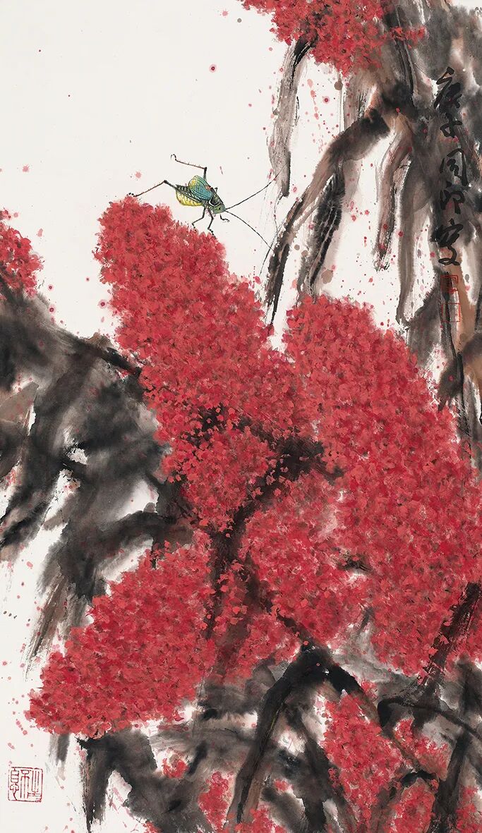 在创作上,这当然需要画家善于深入生活,观察生活,从而选择具有代表性的典型特征作为艺术造型的主要特征,并通过典型化了的表现手法而使之成为典型形式。在《秋声》中,红高梁不再是人们早已十分熟悉的籽粒抱拢成团的拳头般或捣蒜锤般的穗状形式,而是一种半幅射式的网状散码结构。